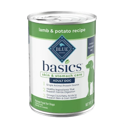 - PACKAGING MAY VARY: Contains twelve (12) 12.5-oz cans of BLUE Basics Skin & Stomach Care, Grain Free Natural Adult Wet Dog Food, Lamb