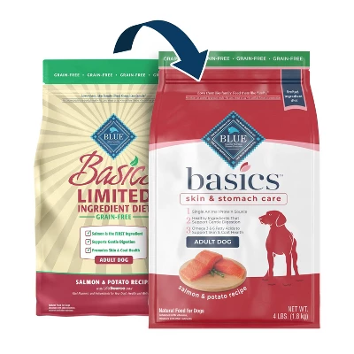 - Contains (1) 4lb bag of BLUE Basics Limited Ingredient Diet, Grain Free Natural Adult Dry Dog Food, Salmon & Potato