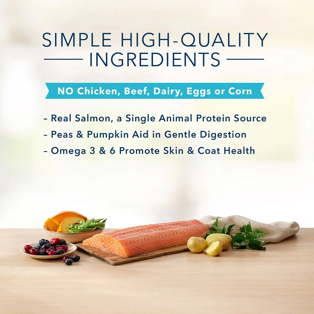 - Starts with real salmon, followed by other high-quality ingredients like potatoes, peas and pumpkin to support healthy digestion, plus gluten-free grains for sensitive tummies.