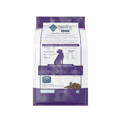BLUE Basics Dog Food is a delicious, limited-ingredient diet made from fewer ingredients selected with care, that may prove helpful to dogs with food sensitivities. All BLUE Basics recipes start with real meat from a single animal protein source not often used in dog food, plus they include pumpkin and easily digested carbohydrates. BLUE Basics senior formula contains ingredients like taurine for heart health support, plus glucosamine and chondroitin to help promote joint health and overall mobility so senior dogs can enjoy their golden years.BLUE Basics Dog Food is a product of the Blue Buffalo company. Based in the United States, Blue Buffalo makes premium-quality pet foods featuring real meat, fruit and vegetables.