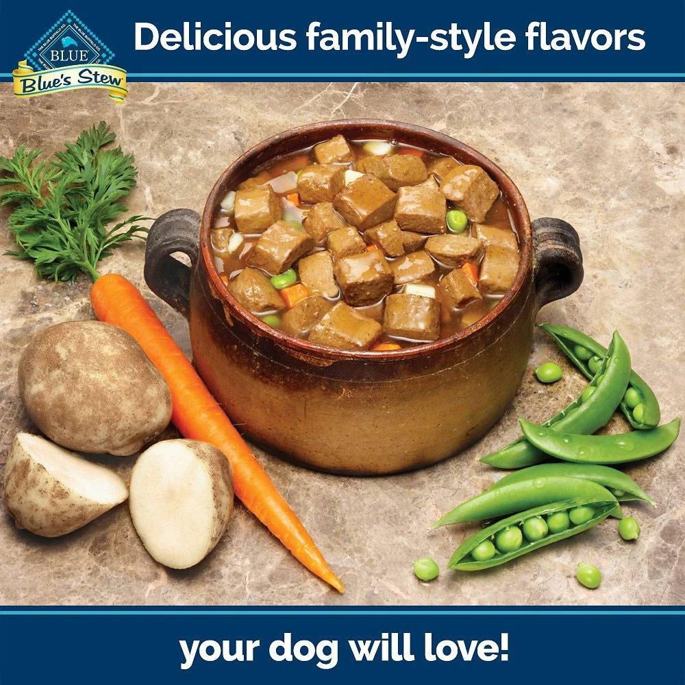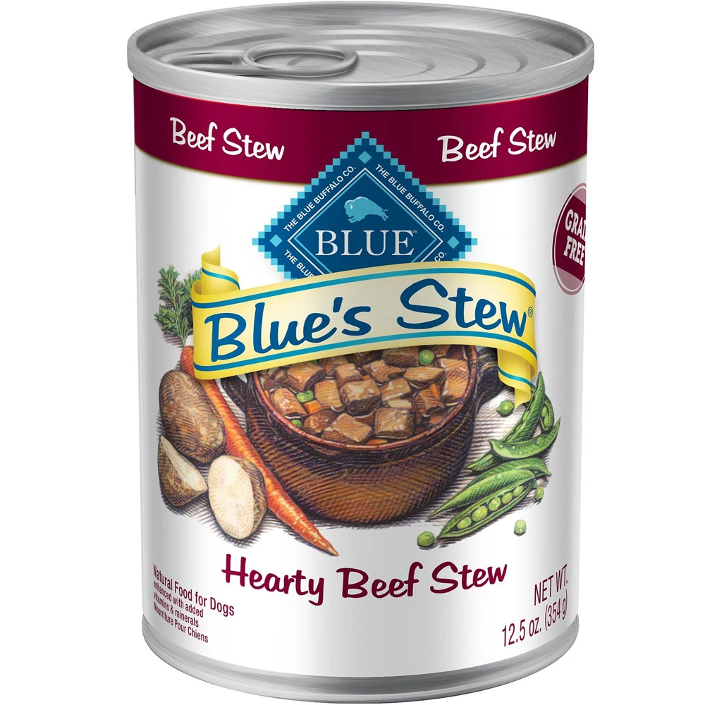 Blue Buffalo Blue’s Stew Natural Adult Wet Dog Food. Paw-fect for your grown-up guy, this irresistibly tasty wet food is made using only the finest natural ingredients. It starts with high-quality protein from tender chunks of beef steeped in a savory gravy, packed with garden veggies, then enhanced with vitamins and minerals. Formulated to support muscle maintenance and the other nutritional needs of your furry friend, the exclusively wholesome ingredients do not contain any by-product meals, corn, wheat, soy, artificial flavors or preservatives.