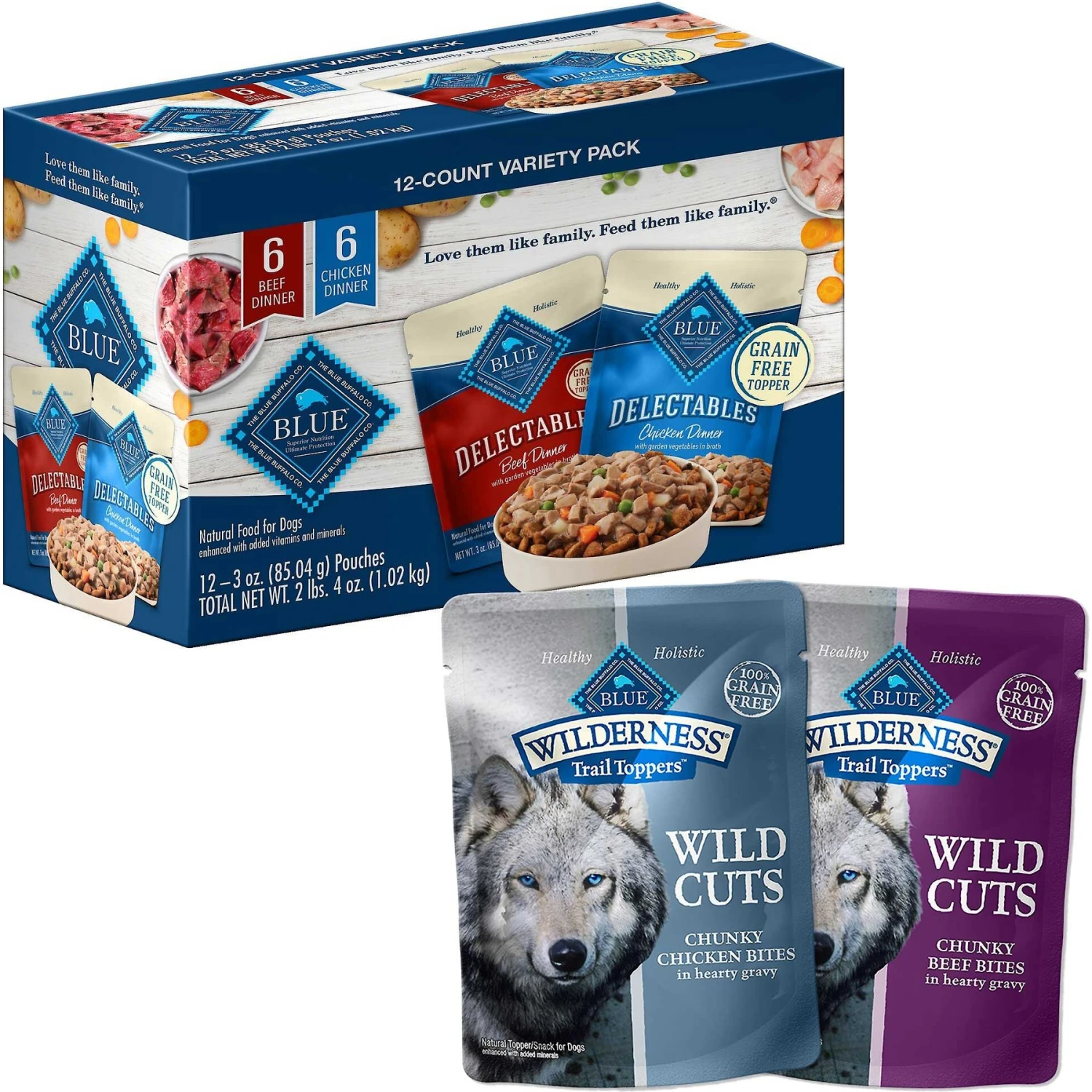 Add a punch of flavor and texture to your dog’s diet with Blue Buffalo Delectables Chicken & Beef Dinner Variety Pack + Wilderness Trail Toppers Wild Cuts Variety Pack Chunky Chicken & Beef Bites in Gravy Dog Food Topper. This bundle comes with four recipes that can be served as meal toppers, enticing mix-ins or healthy snacks on their own. Delectables start with high-quality chicken or beef steeped in a savory and nutritious veggie broth. Meanwhile, Wild Cuts are made with tender bites of real chicken or beef in a delectable gravy. Available in handy, single-serve pouches that are easy to open and store, they make mealtime convenient for you and paws-itively delectable for your doggo.