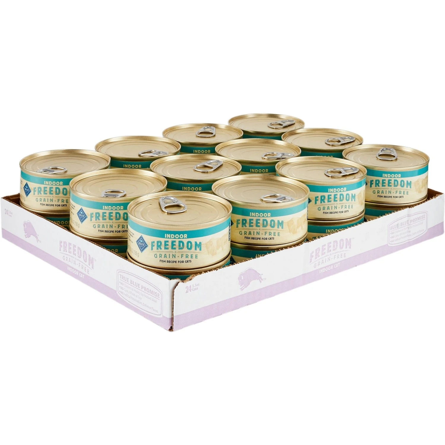 Blue Buffalo Freedom Indoor Adult Fish Recipe Grain-Free Canned Cat Food, 5.5-oz, case of 24—Feed your feline friend the flavorful fish she loves with Blue Buffalo Freedom Grain Free Natural Adult Pate Wet Cat Food. Purr-fect for your grown-up gal, this irresistibly tasty wet food is made using only the finest naturally grain and gluten-free ingredients. It starts with high-protein fish, packed with healthy fruits and veggies, then enhanced with vitamins and minerals. Formulated to support the nutritional needs of adult cats, this delicious pate-style food is made exclusively with wholesome ingredients that do not contain any grain, gluten, by-product meals, corn, wheat, soy, artificial flavors or preservatives.