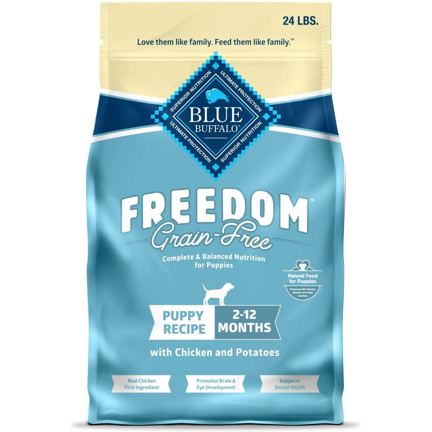 Is your puppy sensitive to certain ingredients? Then feed him Blue Buffalo’s Freedom Puppy Chicken Recipe Grain-Free Dry Dog Food! This delicious, 100% grain-free and gluten-free kibble features real chicken first and is completely free from poultry by-product meals, corn, wheat, soy and artificial flavors and preservatives. And since it’s specially designed for puppies, the kibble is sized smaller and it contains DHA and ARA—these fatty acids are found in mother’s milk and help support brain and eye development. It also includes BLUE’s exclusive LifeSource Bits—a combination of selected antioxidants, minerals and vitamins picked by veterinarians and animal nutritionists to support your pup’s overall health and wellness. Now your paw-tner really has something to wag his tail about!