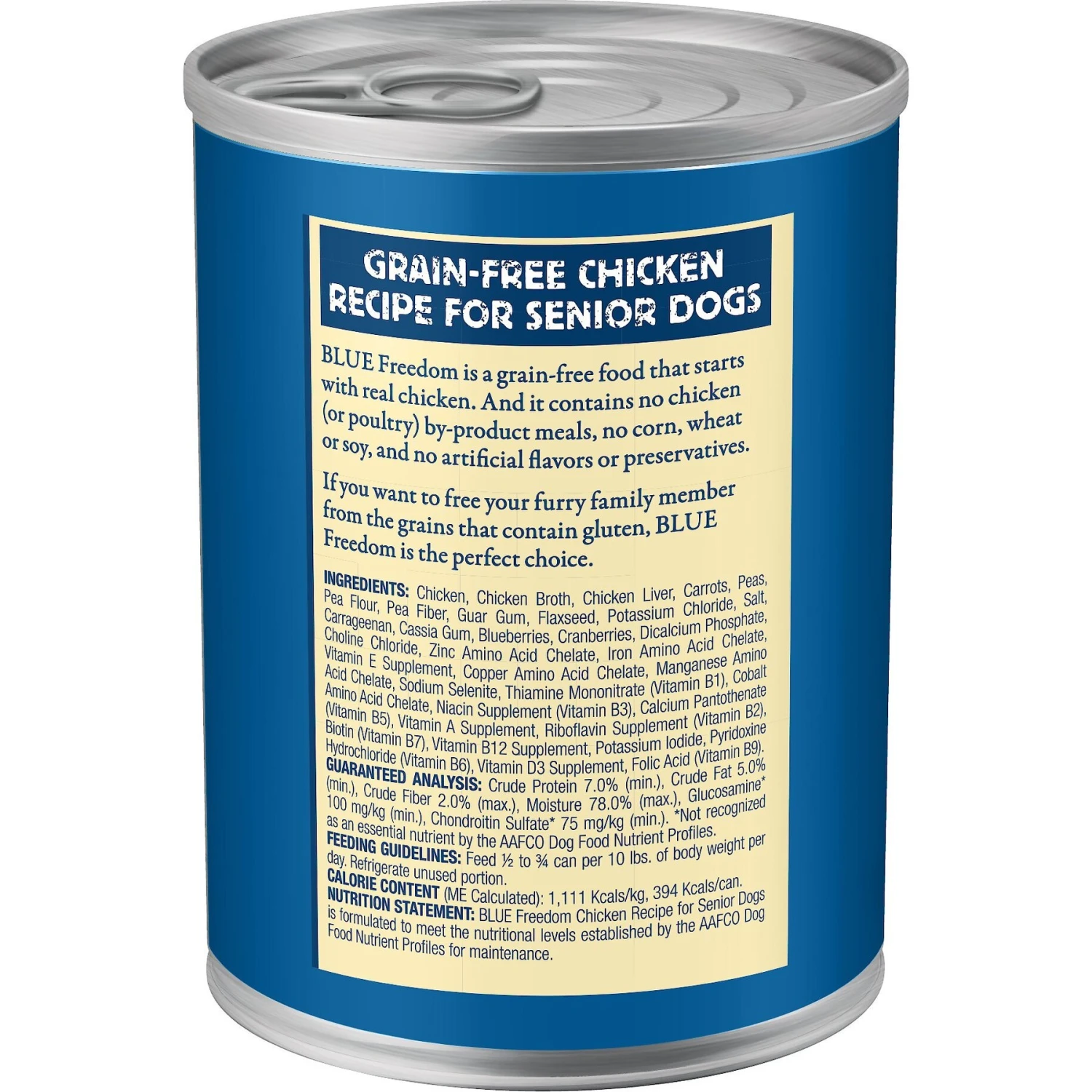 Give your older amigo the nutrition he needs with Blue Buffalo Freedom Grain Free Natural Senior Wet Dog Food. Paw-fect for your senior sidekick, this irresistibly tasty wet food is made using only the finest naturally grain-free and wheat-free ingredients. It starts with tender chunks of high-quality chicken, packed with fruits and veggies, then enhanced with vitamins and minerals. Formulated with complex carbohydrates to promote an active lifestyle, this mouthwatering dog food is made with wholesome ingredients that do not contain any wheat, grain, by-product meals, corn, soy, artificial flavors or preservatives.