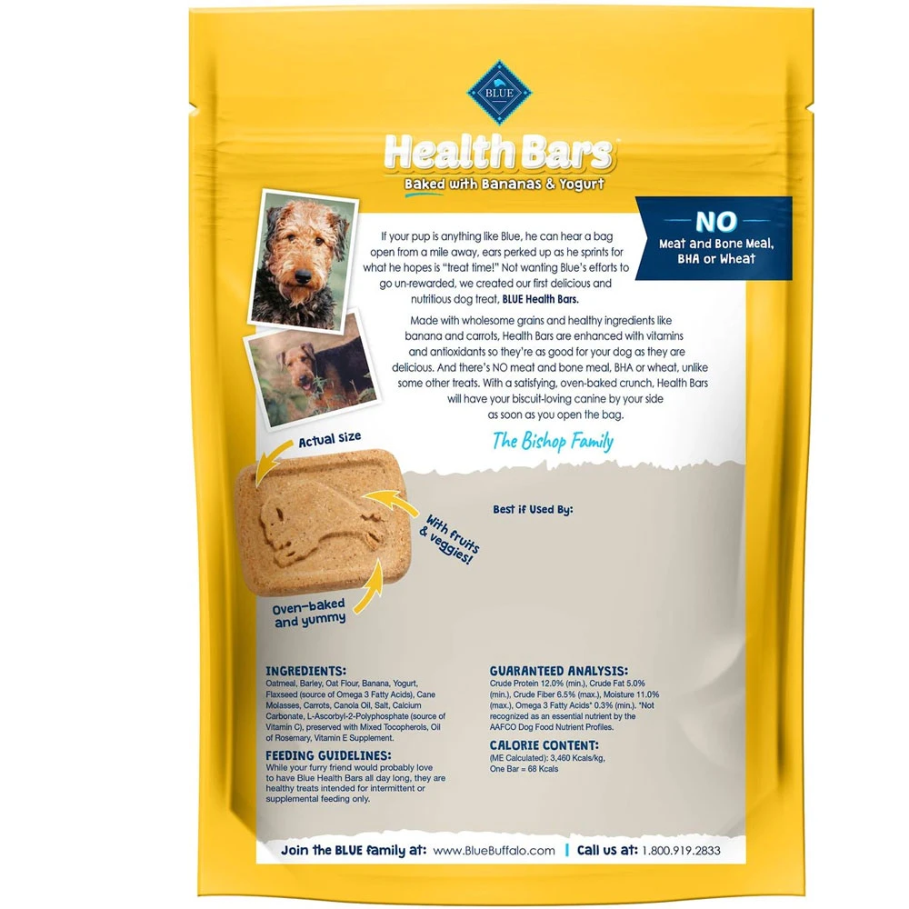 Blue Buffalo Health Bars Baked with Banana & Yogurt Dog Treats deliver the great taste without the corn, wheat and soy known to cause allergic reactions in some dogs. Made with the finest natural ingredients, fortified with omega-3 fatty acids, vitamins and antioxidants, and oven-baked for a big crunch, these treats are as healthy as they are tasty!