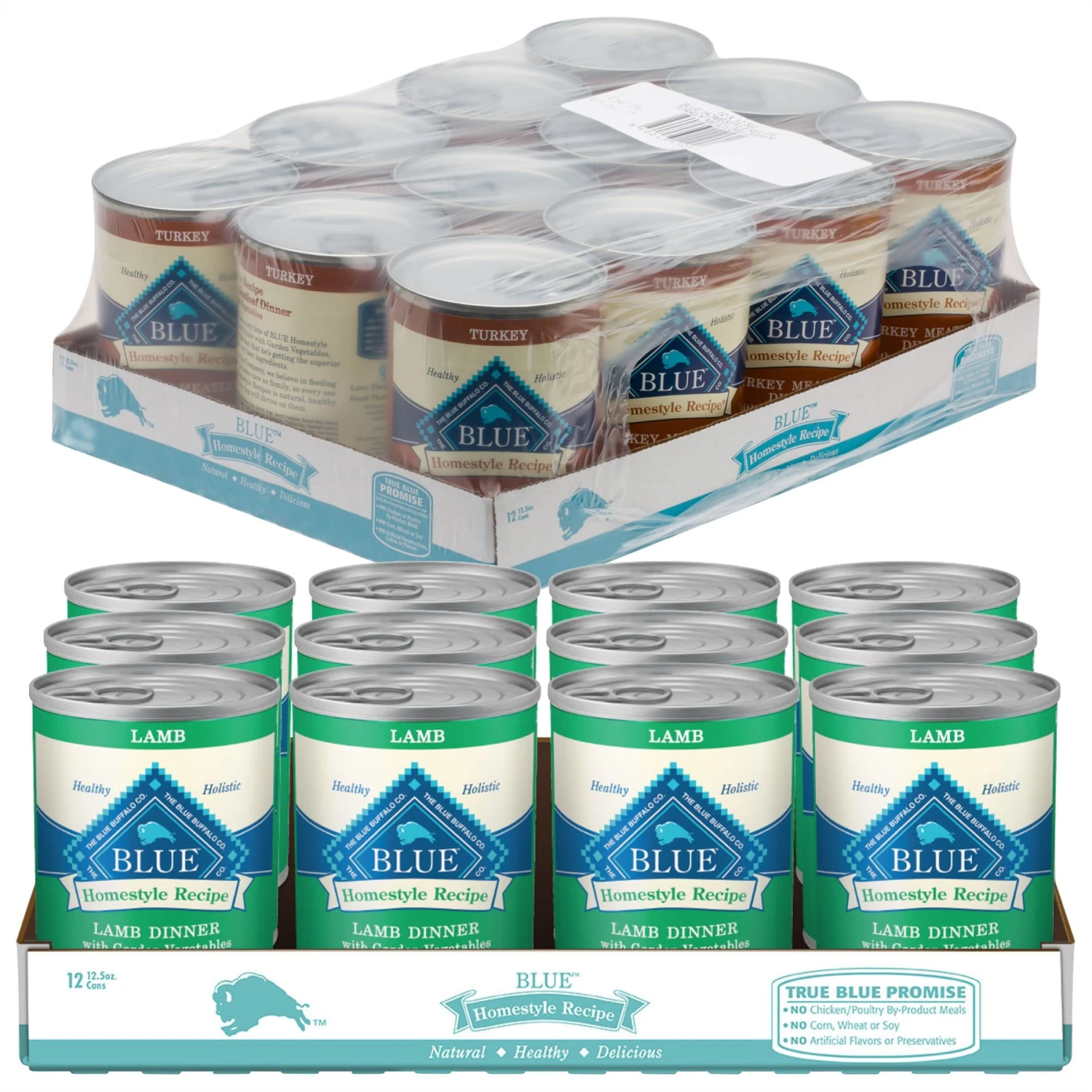 Blue Buffalo Homestyle Recipe Lamb Dinner with Garden Vegetables Canned Dog Food, 12.5-oz, case of 12—Deliver something different for your doggo’s next dinner with Blue Buffalo Homestyle Recipe Natural Adult Wet Dog Food. Paw-fect for your pupper pal, this irresistibly tasty wet food is made using only the finest natural ingredients. It starts with high-quality protein from tender pieces of lamb, packed with garden fruits and veggies, then enhanced with vitamins and minerals. Formulated to support lean muscle mass and the other nutritional needs of your adult amigo, this pate-style dog food is made with wholesome ingredients that do not contain any by-product meals, corn, wheat, soy, artificial flavors, or preservatives.