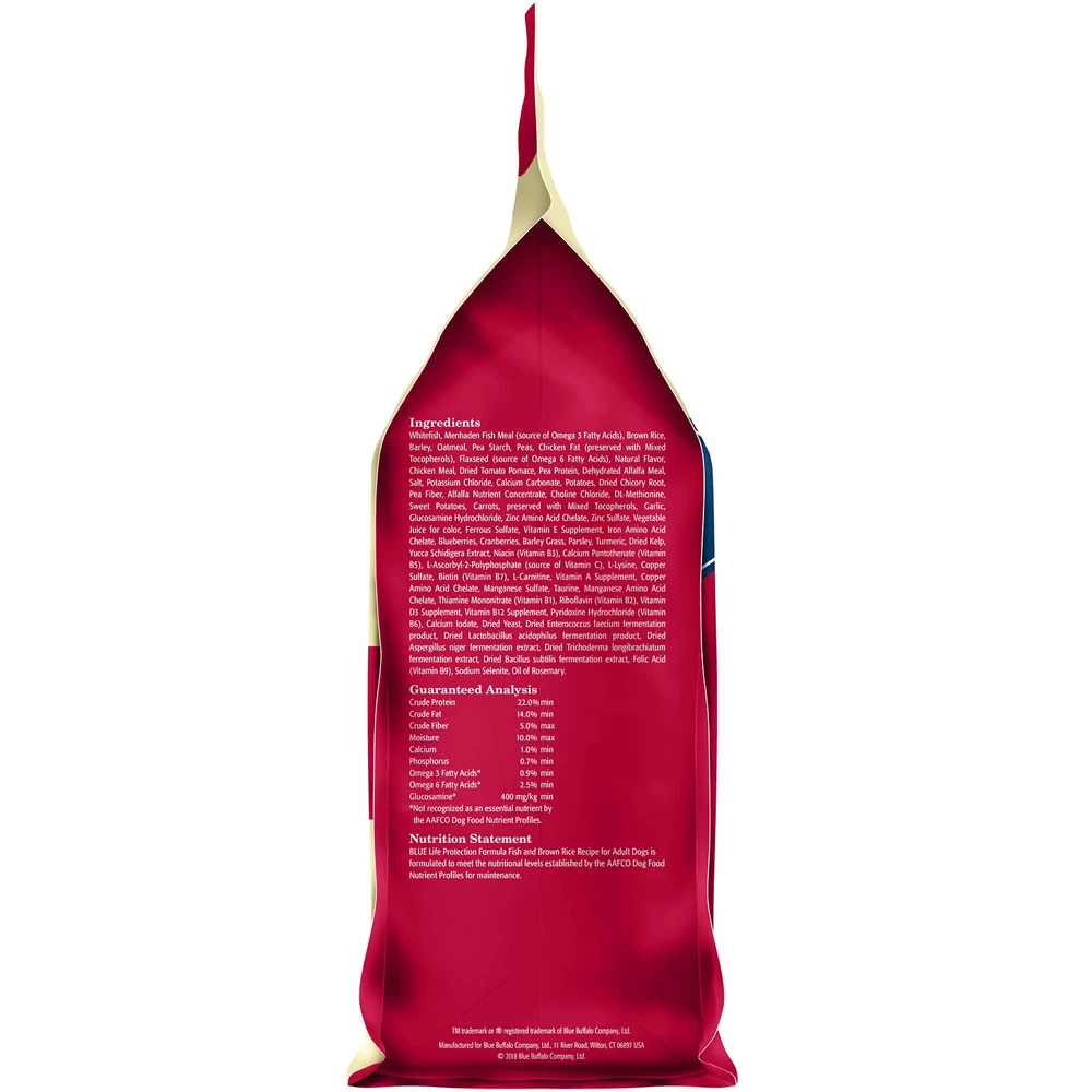 Blue Buffalo Life Protection Formula was created for the health and well-being of dogs. All formulas start with real meat, whole grains, garden veggies and fruit, plus added LifeSource Bits, a precise blend of nutrients that have been enhanced with a Super 7 package of antioxidant-rich ingredients. This Adult Fish & Brown Rice Recipe features delicious, protein-rich deboned whitefish and other natural ingredients for a healthy meal your dog will love.