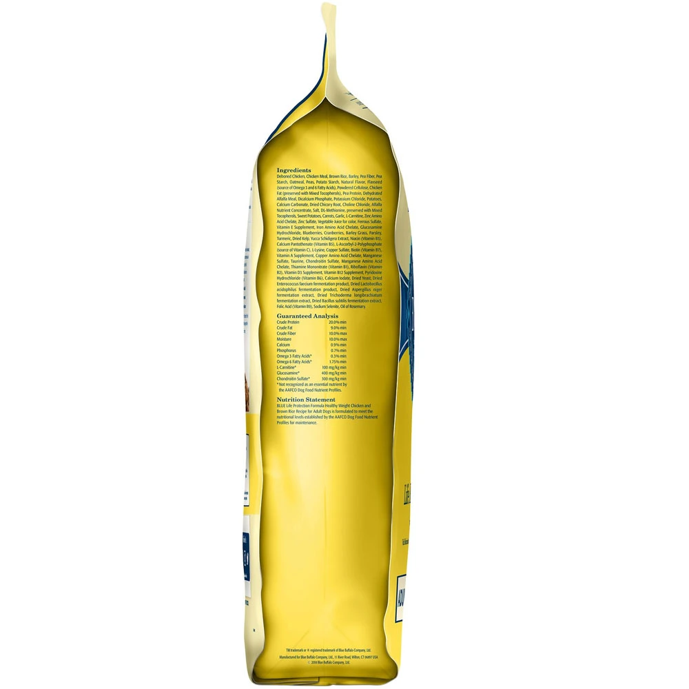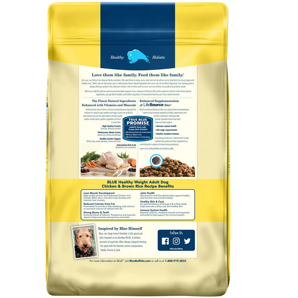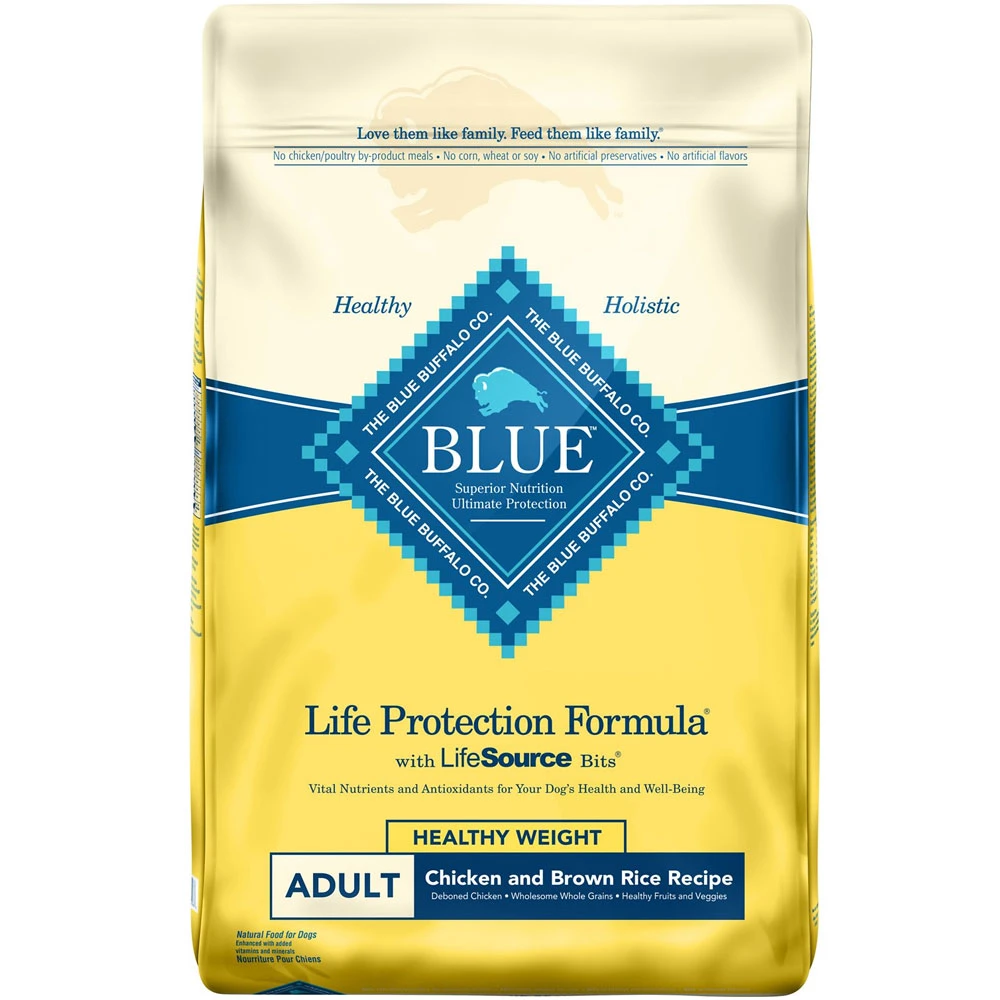 Blue Buffalo Life Protection Formula was created for the health and well-being of dogs. All formulas start with real meat, whole grains, garden veggies and fruit, plus added LifeSource Bits, a precise blend of nutrients that have been enhanced with a Super 7 package of antioxidant-rich ingredients. This Healthy Weight Adult Chicken & Brown Rice Recipe features delicious, protein-rich deboned chicken and is made without excess calories from fat to help dogs achieve and maintain a healthy weight.