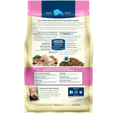 Blue Buffalo Life Protection Formula was created for the health and well-being of dogs. All formulas start with real meat, whole grains, garden veggies and fruit, plus added LifeSource Bits, a precise blend of nutrients that have been enhanced with a Super 7 package of antioxidant-rich ingredients. This Small Breed Adult Chicken & Brown Rice Recipe features delicious, protein-rich deboned chicken and is made with increased protein and carbohydrates to meet higher energy needs of smaller dogs.