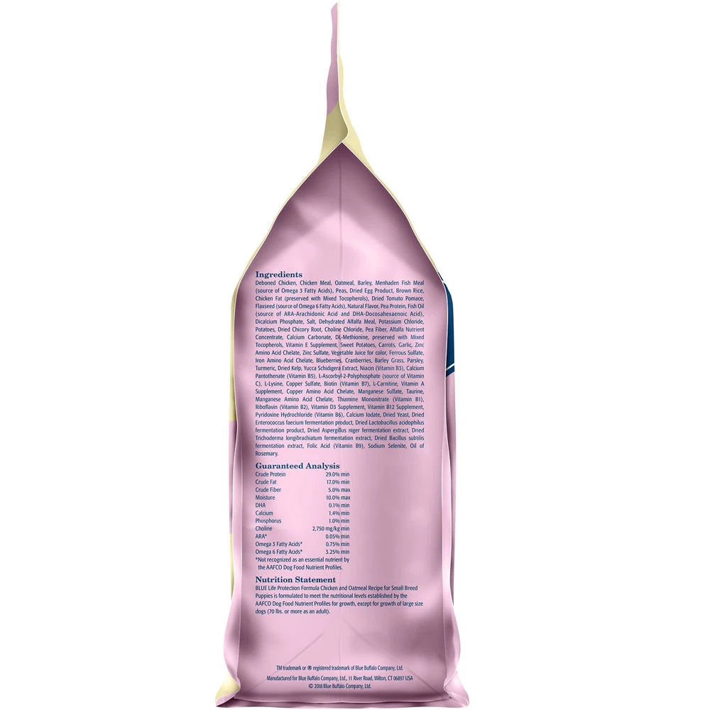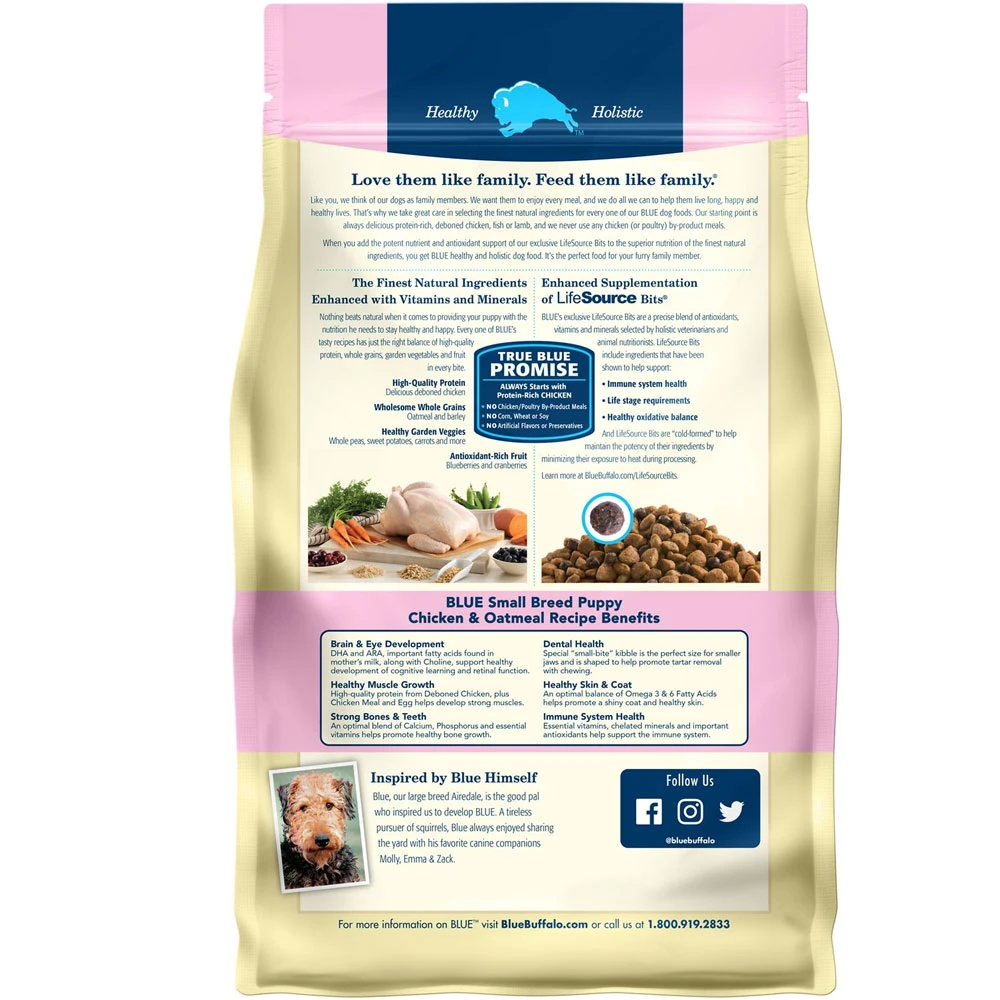 Blue Buffalo Life Protection Formula was created for the health and well-being of dogs. All formulas start with real meat, whole grains, garden veggies and fruit, plus added LifeSource Bits, a precise blend of nutrients that have been enhanced with a Super 7 package of antioxidant-rich ingredients. This Small Breed Puppy Chicken & Oatmeal Recipe features delicious, protein-rich deboned chicken. And because puppyhood is such an important stage, it features ingredients that support healthy growth and development.