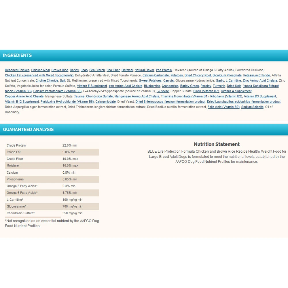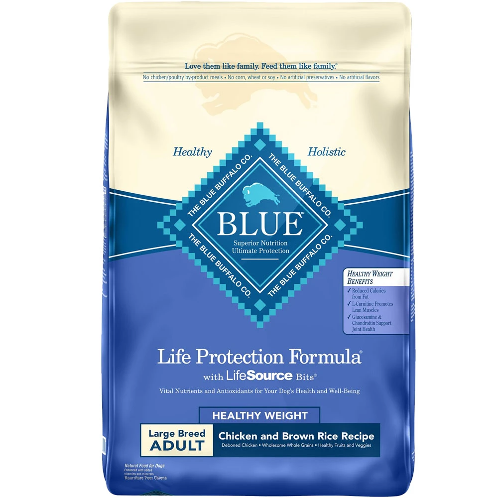 Blue Buffalo Life Protection Formula was created for the health and well-being of dogs. All formulas start with real meat, whole grains, garden veggies and fruit, plus added LifeSource Bits, a precise blend of nutrients that have been enhanced with a Super 7 package of antioxidant-rich ingredients. This Healthy Weight Adult Chicken & Brown Rice Recipe features delicious, protein-rich deboned chicken and is made without excess calories from fat to help dogs achieve and maintain a healthy weight.