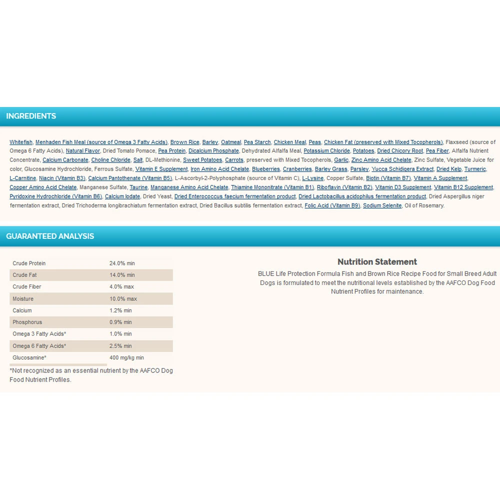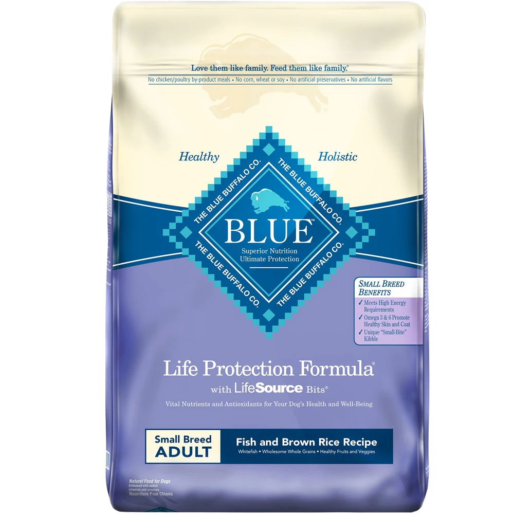 Blue Buffalo Life Protection Formula was created for the health and well-being of dogs. All formulas start with real meat, whole grains, garden veggies and fruit, plus added LifeSource Bits, a precise blend of nutrients that have been enhanced with a Super 7 package of antioxidant-rich ingredients. This Small Breed Adult Fish & Brown Rice Recipe features delicious, protein-rich deboned whitefish and is made with increased protein and carbohydrates to meet the higher energy needs of smaller dogs.