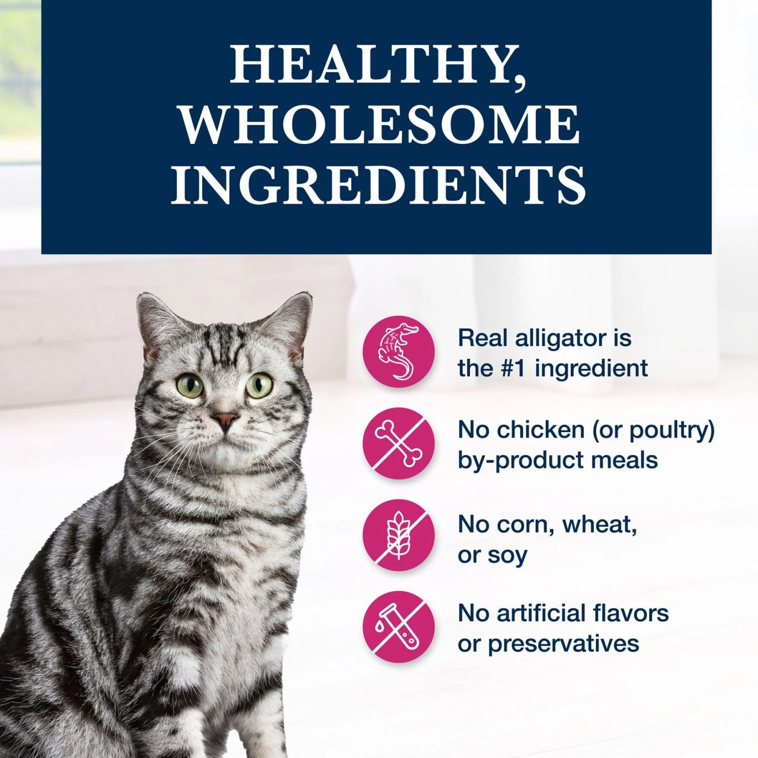- Formulated to help minimize negative reactions to food with alligator—a unique protein source that is rarely linked to food intolerance in cats.