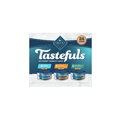 - Contains one (1) Variety Pack of BLUE Tastefuls Natural Pate Wet Cat Food, Chicken, Turkey & Chicken and Ocean Fish & Tuna Entrées 5.5-oz cans (24 count – 8 of each flavor)
