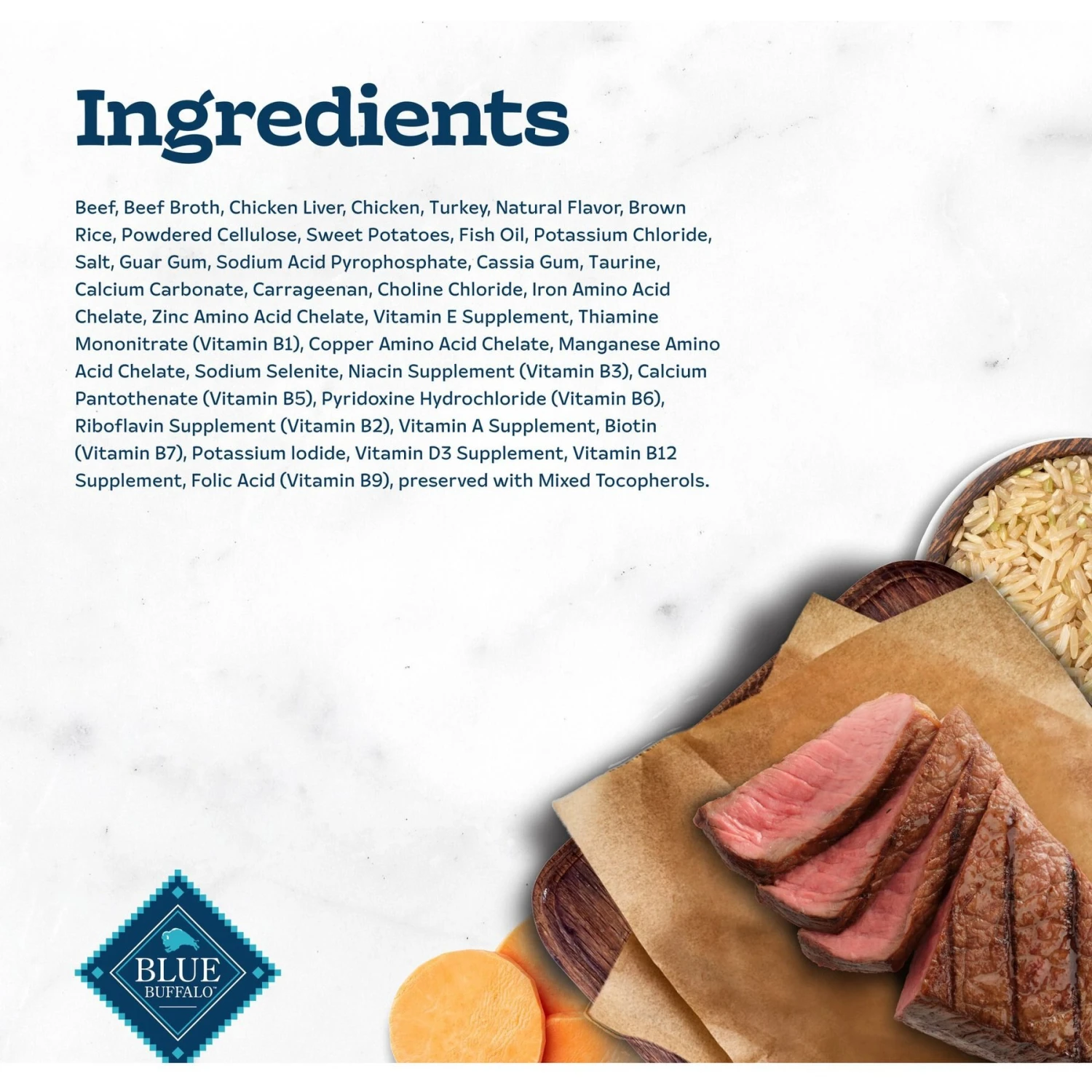 Get those whiskers wiggling with excitement for Blue Buffalo Tastefuls Natural Pate Beef Entrée Wet Cat Food. Of course, real beef is the first and foremost important ingredient, but you will also find yummy brown rice and sweet potatoes to amp up the nutrition for your cat’s daily activities. This meal comes with a pleasantly-silky smooth texture that is loaded with flavor and hydration for the pickiest of eaters—plus, you won’t find any unnecessary fillers, artificial flavors, or preservatives for a truly ideal mouthwatering mealtime.