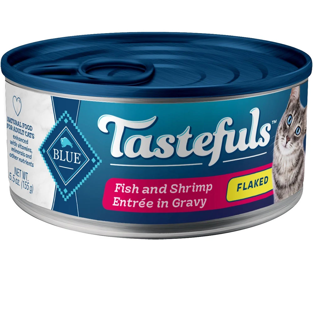 Blue Buffalo Tastefuls Natural Flaked Fish ? Shrimp Entree in Gravy Wet Cat Food. Of course, fish and shrimp are the first and foremost important ingredients, but you will also find yummy brown rice and sweet potatoes in a savory gravy to amp up the nutrition. This meal comes with a pleasantly-flaky texture that is loaded with flavor and hydration for the pickiest of eaters plus, you won’t find any unnecessary fillers, artificial flavors, or preservatives for a truly ideal mouthwatering mealtime.