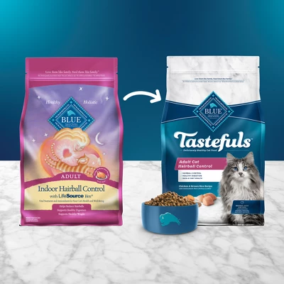 - HAIRBALL CONTROL: BLUE Indoor Hairball Control adult cat food contains high-quality protein and natural sources of fiber to help provide optimal nutrient absorption while minimizing hairballs. Plus, it contains omega 3 & 6 fatty acids to help promote a shiny coat and healthy skin.