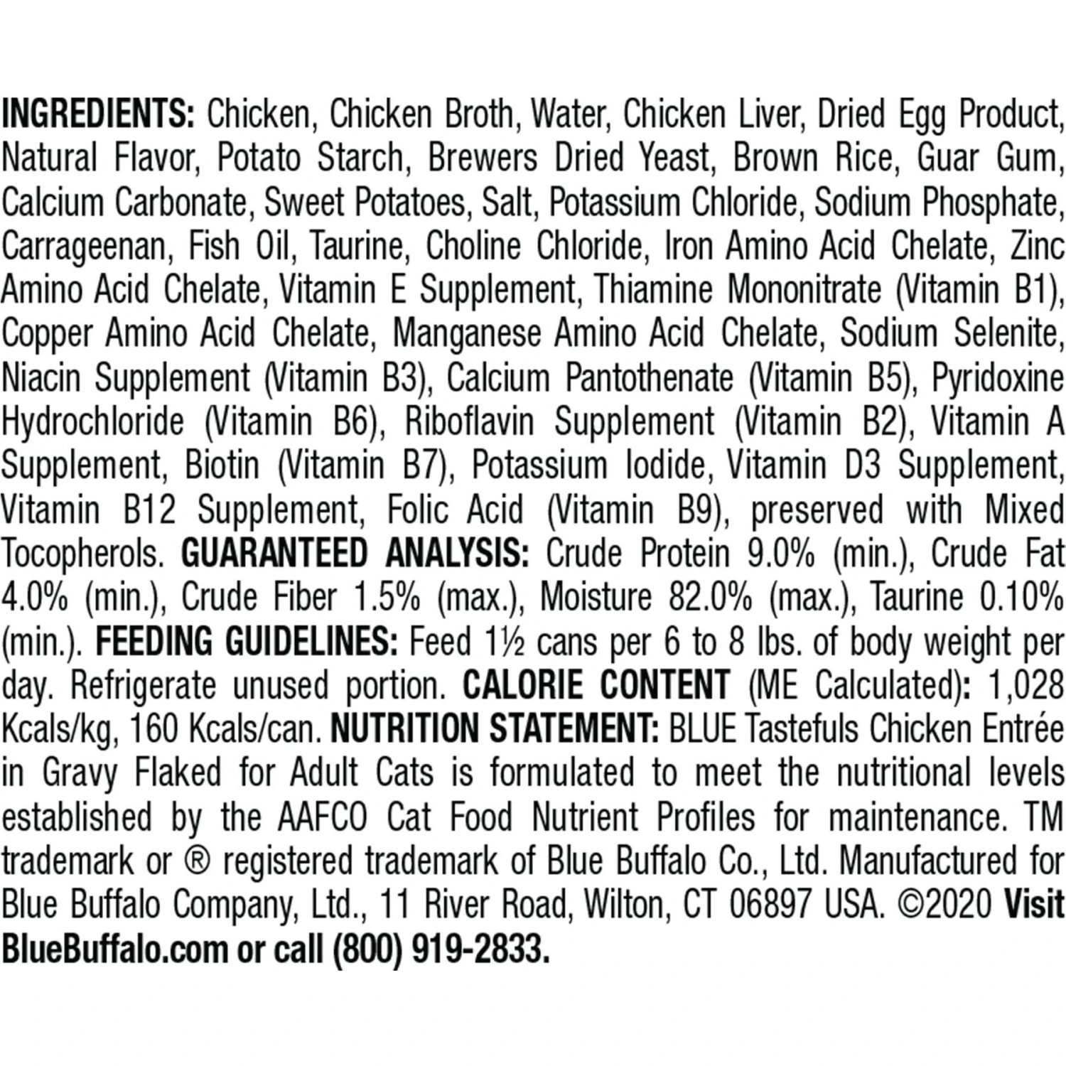 The Blue Buffalo Tastefuls Natural Flaked Chicken Entree in Gravy Wet Cat Food features tender flakes of chicken as the first ingredient. There’s also plenty of brown rice and sweet potatoes, all in a savory gravy. The recipe is enhanced with vitamins, minerals and other nutrients, so it has the great taste your kitty wants and the healthy ingredients that you prefer to feed. Its high moisture content can even help your furbaby to stay hydrated.