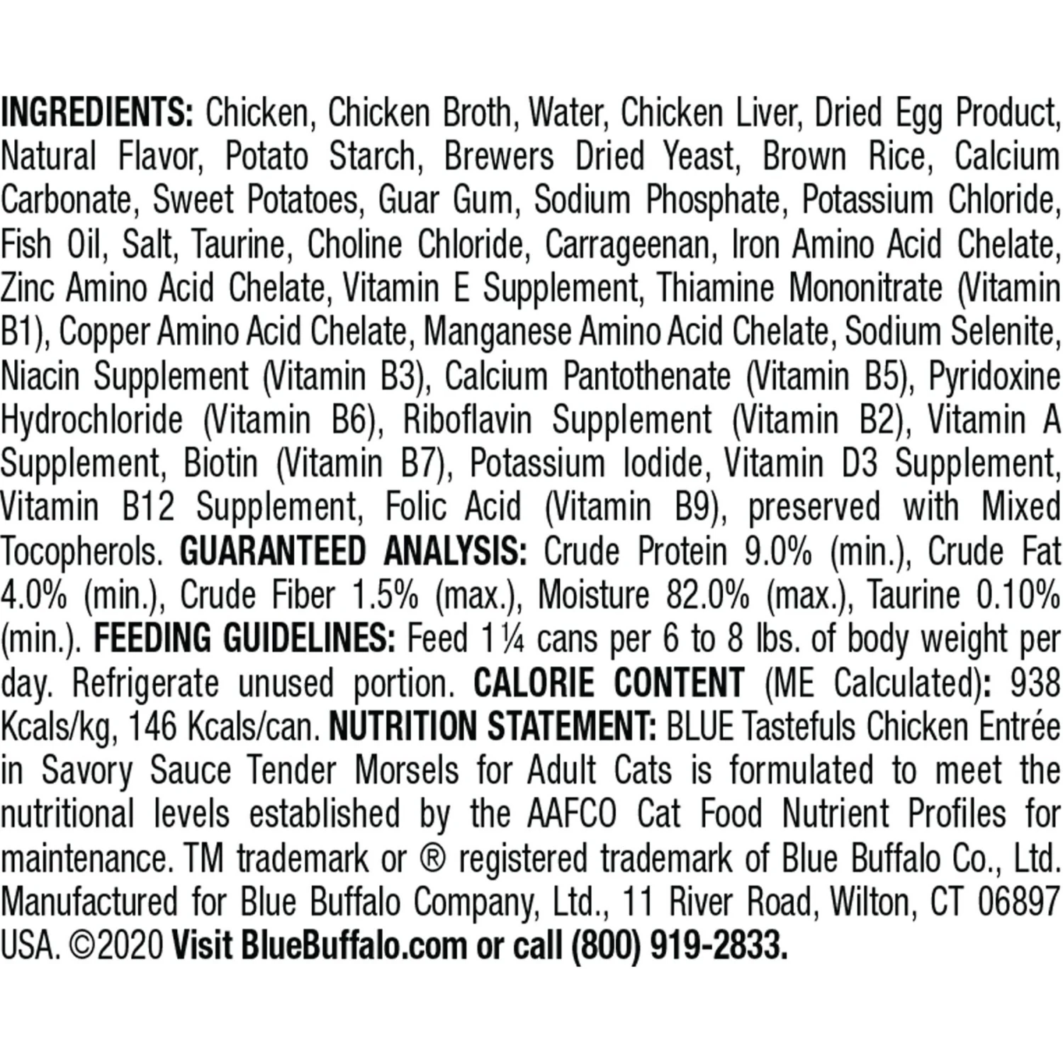 The Blue Buffalo Tastefuls Natural Tender Morsels Chicken Entree Wet Cat Food features mouthwatering morsels of real chicken as the first ingredient. There’s also plenty of brown rice and sweet potatoes, all in a savory gravy. The recipe is enhanced with vitamins, minerals and other nutrients, so it has the great taste your kitty wants and the healthy ingredients that you prefer to feed. Its high moisture content can even help your furbaby to stay hydrated.