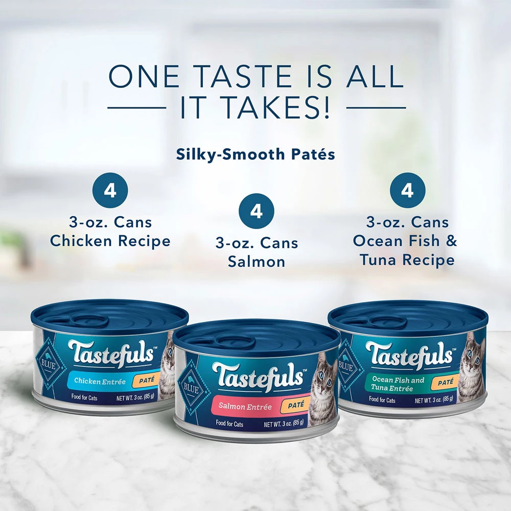 Blue Buffalo Tastefuls Natural Pate Salmon, Chicken, Ocean Fish & Tuna Entrees Variety Pack Wet Cat Food. Of course, salmon, chicken, ocean fish, and tuna are the first and foremost important ingredients in this variety pack, but you will also find yummy brown rice and sweet potatoes to amp up the nutrition. This meal comes with a pleasantly-silky smooth texture that is loaded with flavor and hydration for the pickiest of eaters plus, you won’t find any unnecessary fillers, artificial flavors, or preservatives for a truly ideal mouthwatering mealtime.