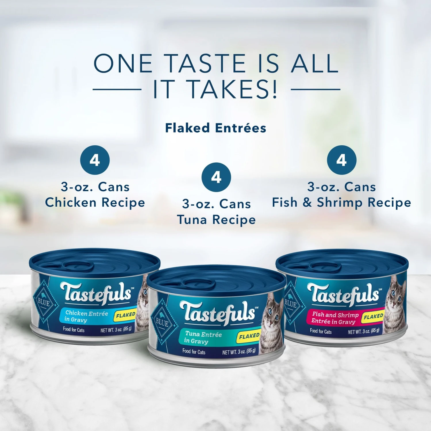 Blue Buffalo Tastefuls Tuna, Chicken, Fish & Shrimp Entrées Variety Pack Flaked Wet Cat Food, 3-oz can, case of 12—Get those whiskers wiggling with excitement for Blue Buffalo Tastefuls Natural Flaked Tuna, Chicken, Fish & Shrimp Entrées Variety Pack Wet Cat Food. Of course, chicken, fish, and tuna are the first and foremost important ingredients in this variety pack, but you will also find yummy brown rice and sweet potatoes in a savory gravy to amp up the nutrition. This meal comes with a pleasantly-flaky texture that is loaded with flavor and hydration for the pickiest of eaters—plus, you won’t find any unnecessary fillers, artificial flavors, or preservatives for a truly ideal mouthwatering mealtime.