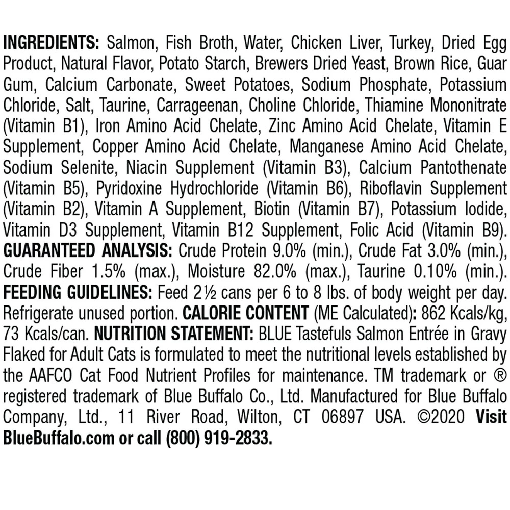 Blue Buffalo Tastefuls Natural Flaked Salmon Entree in Gravy Wet Cat Food. Of course, salmon is the first and foremost important ingredient, but you will also find yummy brown rice and sweet potatoes in a savory gravy to amp up the nutrition. This meal comes with a pleasantly-flaky texture that is loaded with flavor and hydration for the pickiest of eaters plus, you won’t find any unnecessary fillers, artificial flavors, or preservatives for a truly ideal mouthwatering mealtime.