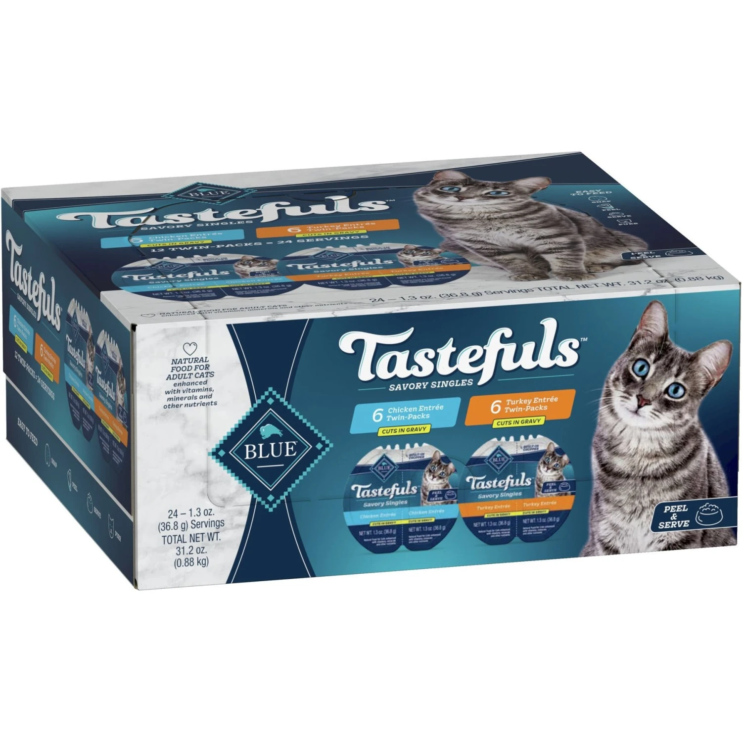 Your hungry feline won’t have to wait long for Blue Buffalo Tastefuls Savory Singles Chicken & Turkey Entree Variety Pack Cuts in Gravy Wet Cat Food! This variety pack features tasty cuts of chicken or turkey as the first ingredient, along with savory gravy, wholesome brown rice, and sweet potatoes. Tastefuls Savory Singles offer portions that are just right for one meal, so you can stop storing open cat food in the fridge. Plus, the easy-to-serve twin-pack cups make feeding a breeze—no utensils necessary! Just snap it, peel it, and serve it to your cat.