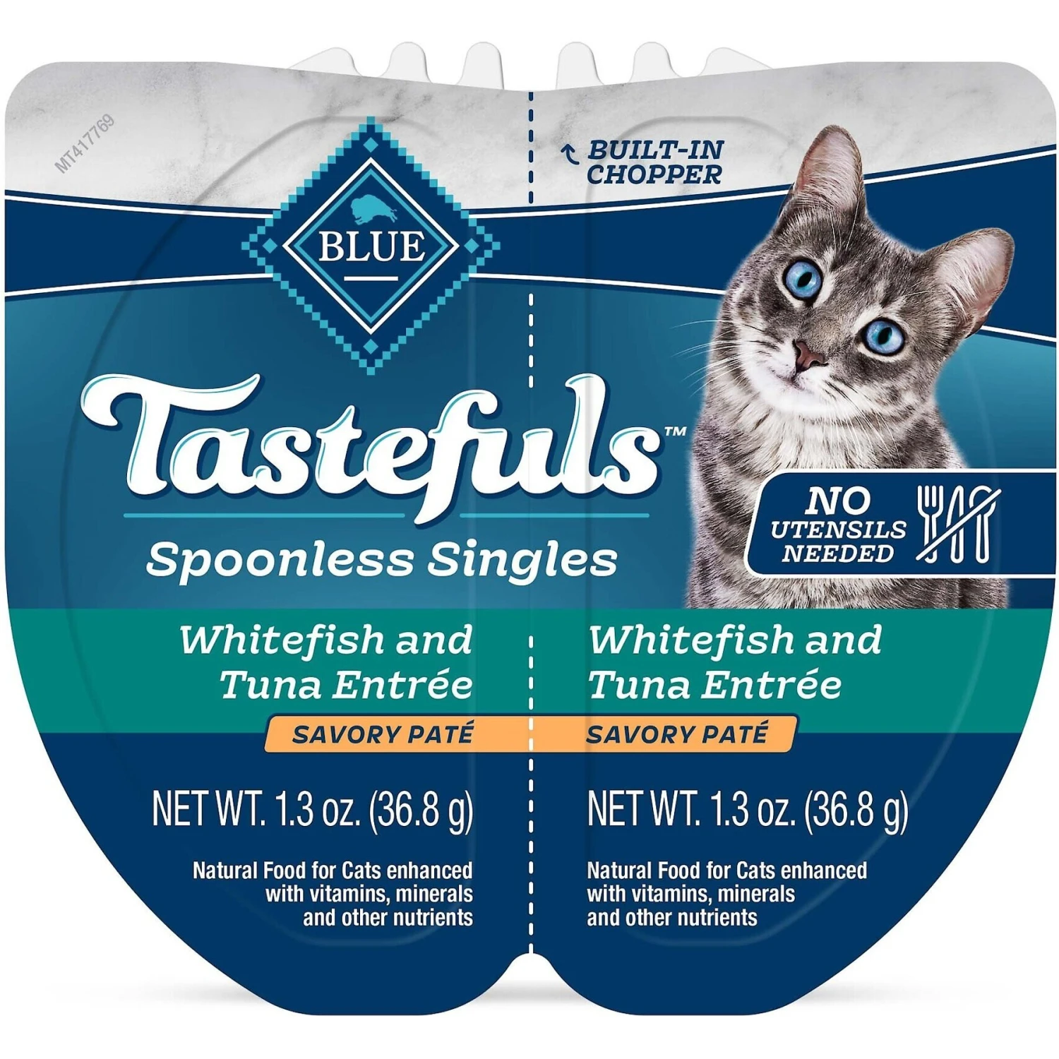 Treat your furry feline to the delightfully wholesome tastes of Blue Buffalo Tastefuls Spoonless Singles White Fish and Tuna Entrée Pate Adult Cat Food. This yummy pâté has a smooth, silky texture and is made of whitefish, tuna, brown rice, and sweet potatoes. These easy-to-serve meals come with a built-in chopper that lets you slice and dice the food to suit your pal’s special palette without dirtying excess utensils. Each paw-fectly portioned pate cup is made without artificial flavors, preservatives, corn, wheat, or soy—making these meals a healthy addition to your fur baby’s menu. This wet cat food has a high moisture content that can help him stay hydrated, and it is enhanced with healthy vitamins and minerals that can help keep your cat happy and healthy.