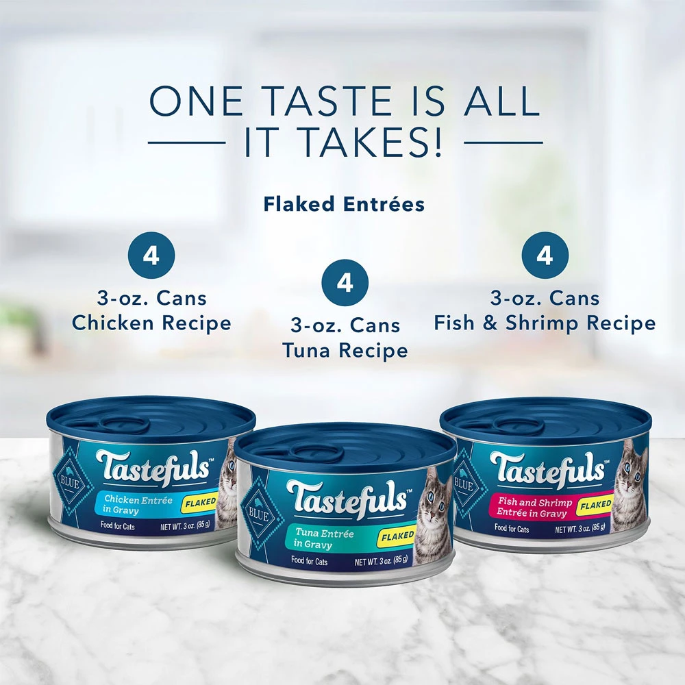 Blue Buffalo Tastefuls Natural Flaked Tuna, Chicken, Fish & Shrimp Entrees Variety Pack Wet Cat Food. Of course, chicken, fish, and tuna are the first and foremost important ingredients in this variety pack, but you will also find yummy brown rice and sweet potatoes in a savory gravy to amp up the nutrition. This meal comes with a pleasantly-flaky texture that is loaded with flavor and hydration for the pickiest of eaters plus, you won’t find any unnecessary fillers, artificial flavors, or preservatives for a truly ideal mouthwatering mealtime.