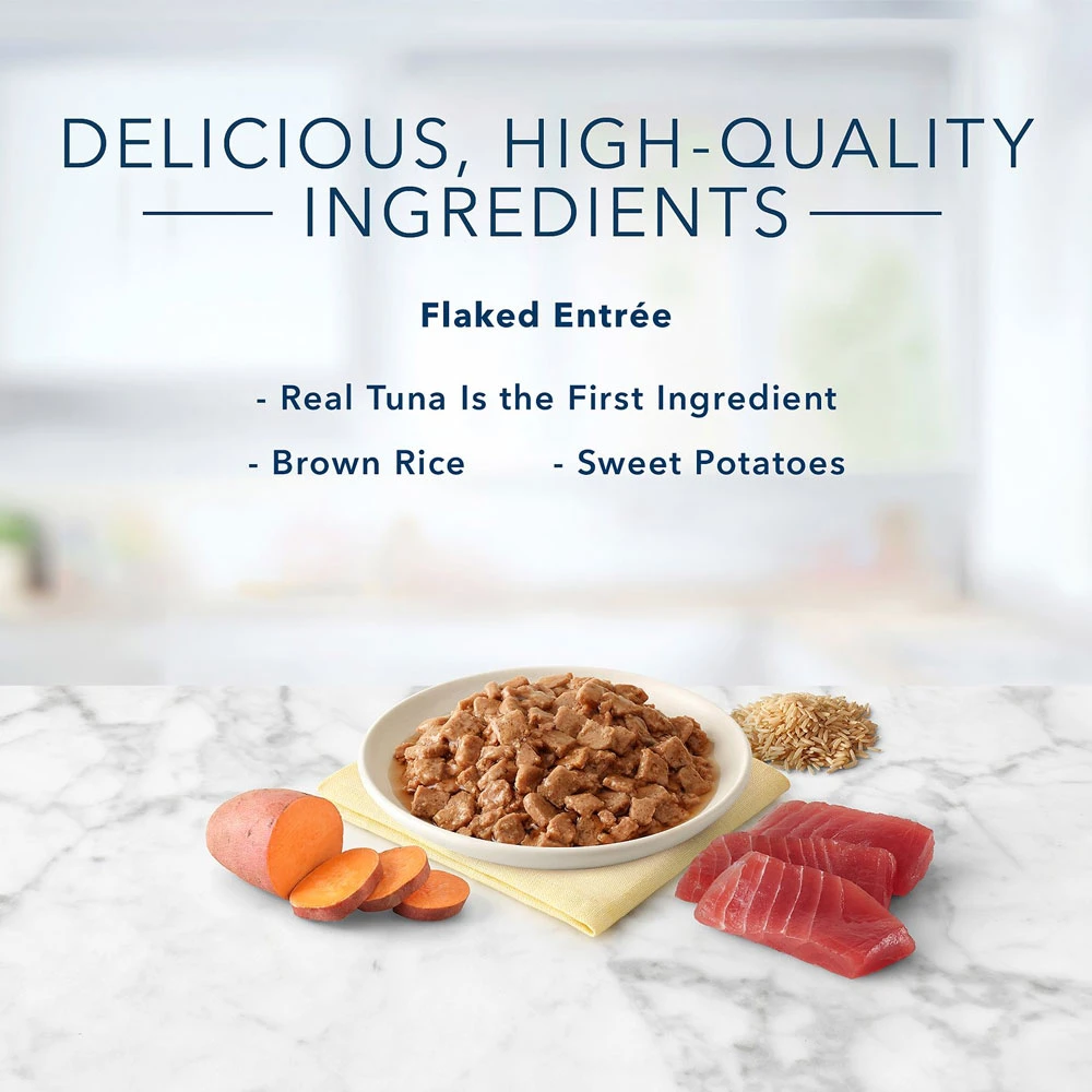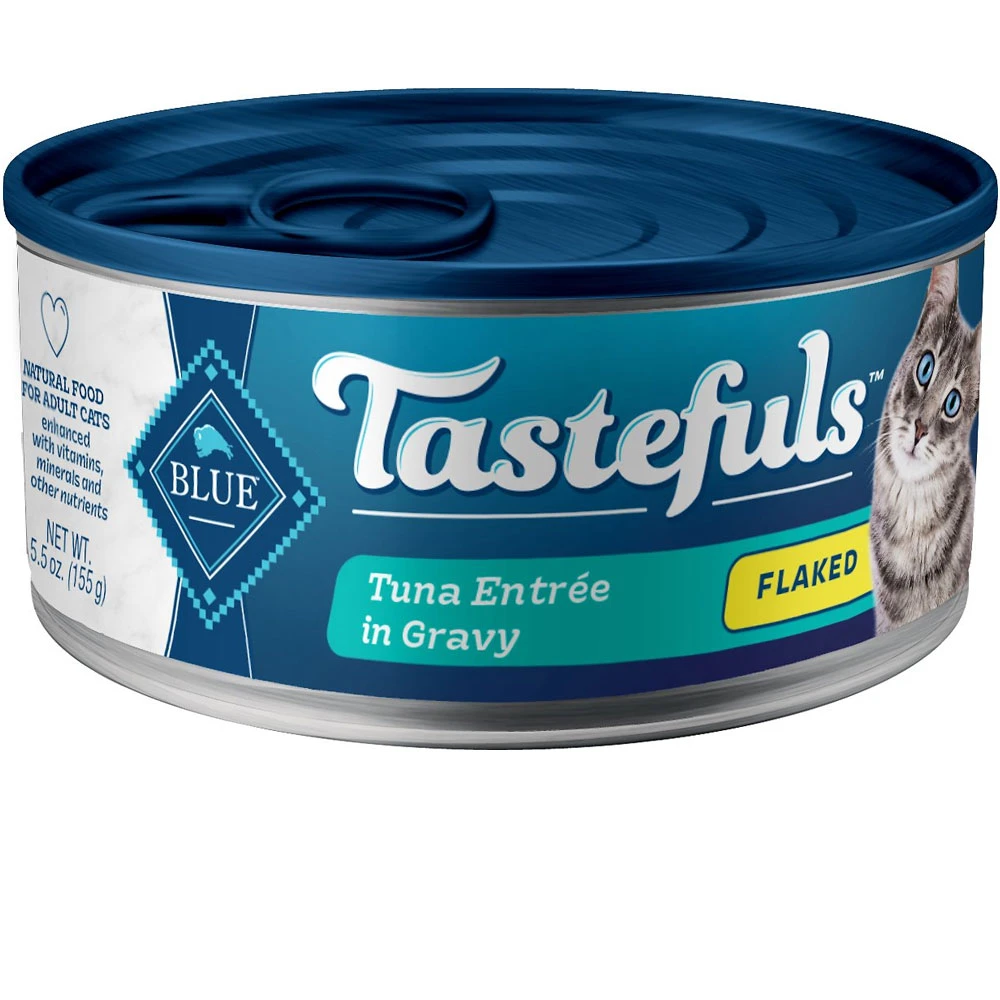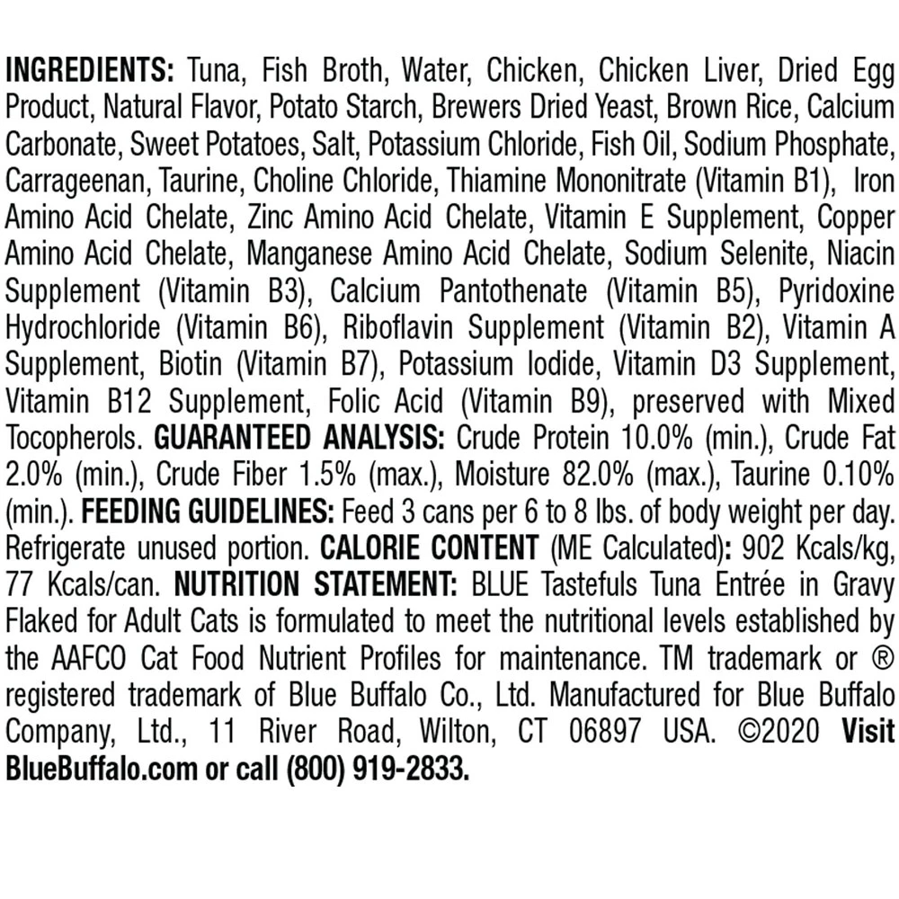 Blue Buffalo Tastefuls Natural Flaked Tuna Entree in Gravy Wet Cat Food. Of course, tuna is the first and foremost important ingredient, but you will also find yummy brown rice and sweet potatoes in a savory gravy to amp up the nutrition. This meal comes with a pleasantly-flaky texture that is loaded with flavor and hydration for the pickiest of eaters plus, you won’t find any unnecessary fillers, artificial flavors, or preservatives for a truly ideal mouthwatering mealtime.