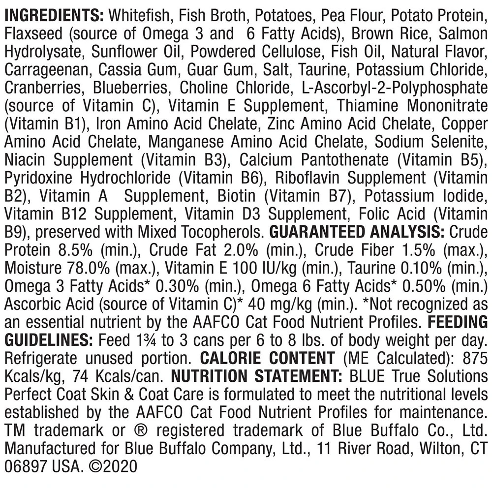 Blue Buffalo True Solutions Perfect Coat Natural Skin & Coat Care! This scrumptious adult wet cat food is formulated by Blue Buffalo’s team of veterinarians and animal nutritionists. It’s crafted with real whitefish first for the high-quality protein your feline deserves and features other natural ingredients, too! Packed with vitamins, minerals as well as other nutrients, this recipe is rich in omega fatty acids to support healthy skin and a lustrous coat. And you can feel good knowing it’s made without corn, wheat, soy, dairy or eggs!