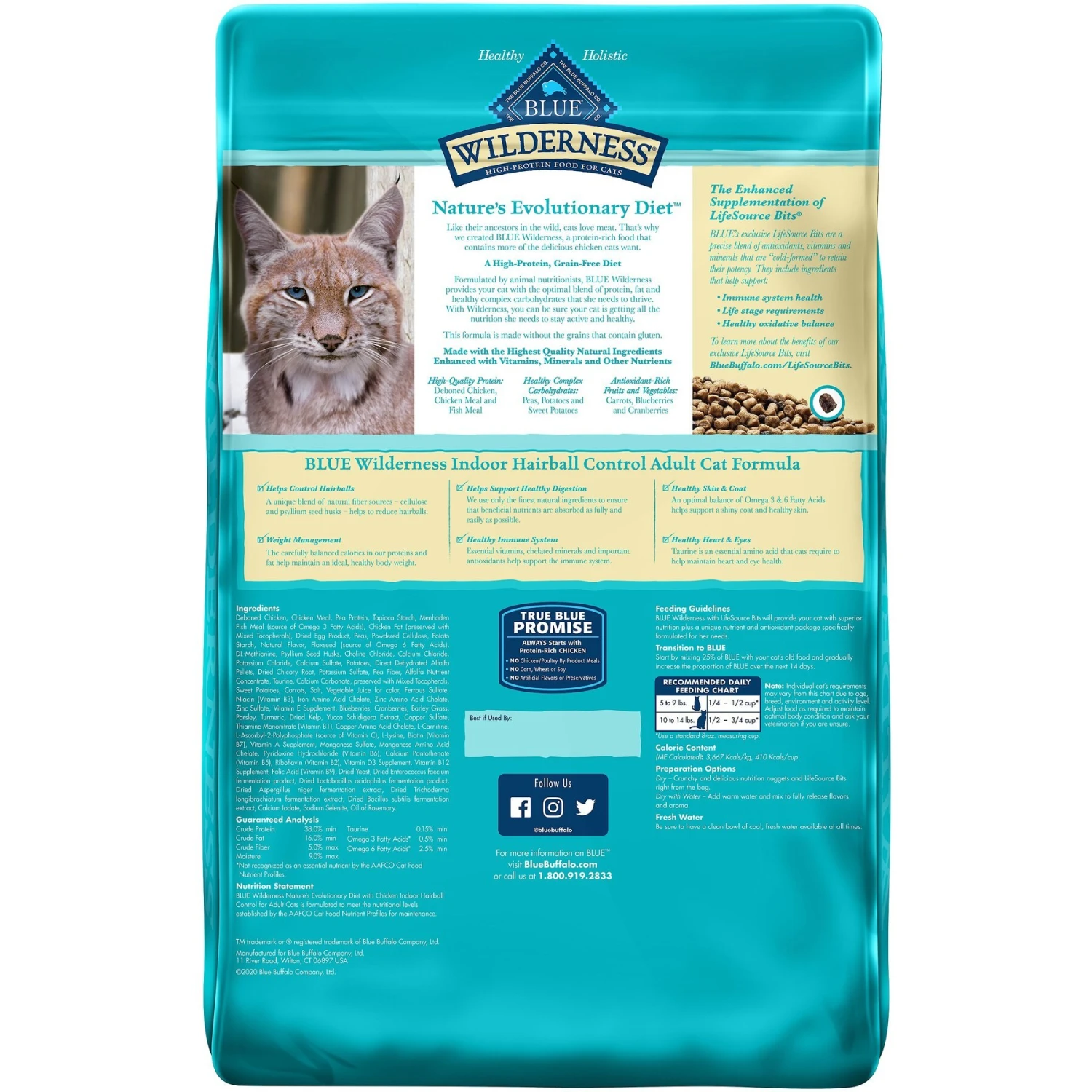 Help your feline friend get a handle on hairballs with Blue Buffalo Wilderness High Protein Grain Free Natural Adult Indoor Hairball Control Dry Cat Food, Chicken. This grain-free formula contains a unique blend of natural fibers designed to help your kitty eliminate pesky hairballs. It contains a carefully-formulated blend of vitamins, minerals and antioxidants to help support her overall health and well-being and is made without the use of corn, wheat, soy or artificial flavors. This delicious formula also features real chicken to help satisfy your kitty’s inner wildcat—and her meow-worthy craving for meat!