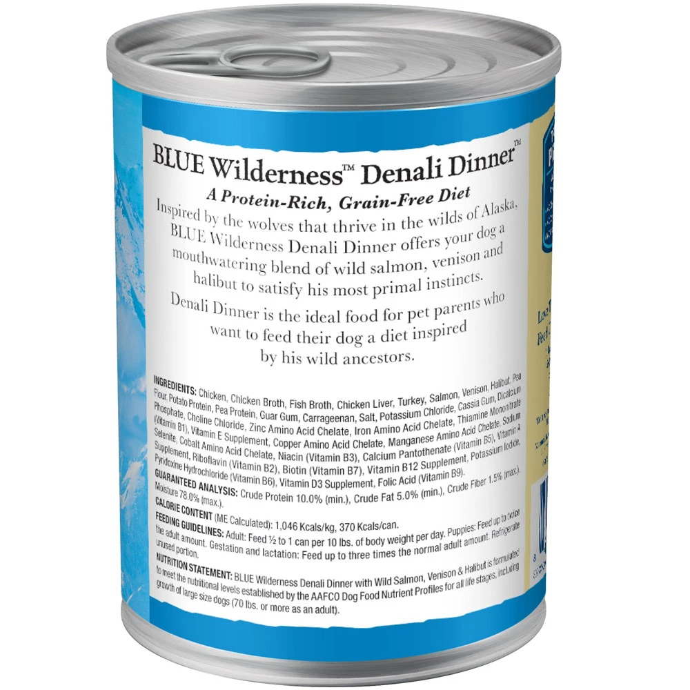 Blue Buffalo Wilderness Denali Dinner High Protein Grain Free, Natural Wet Dog Food. Paw-fect for your doggie dude, this irresistibly tasty wet food is made using only the finest naturally grain and gluten-free ingredients. It starts with high-quality protein from an exotic blend of wild salmon, venison and halibut, packed with fruits and veggies, then enhanced with vitamins and minerals. Formulated to promote an active lifestyle and healthy muscle growth, this high-protein dog food is made with wholesome ingredients that do not contain any grain, gluten, by-product meals, corn, wheat, soy, artificial flavors or preservatives.