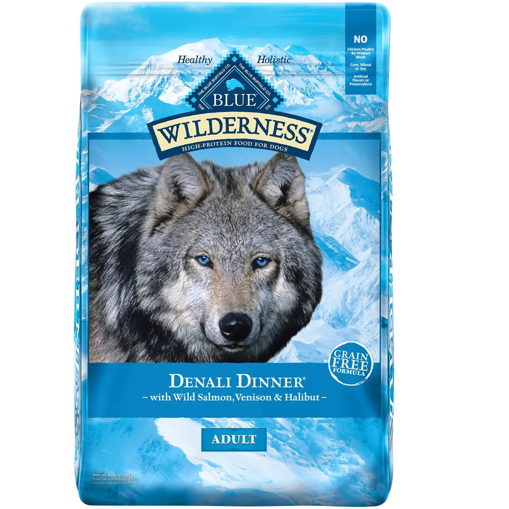 Blue Buffalo Wilderness Denali Dinner and Wild Salmon, Venison & Halibut Grain-Free Dry Dog Food! A unique protein-rich blend of wild salmon, venison and halibut will have your dog’s inner wolf howling for the tantalizing tastes of the Alaskan frontier. Not only does this recipe support your dog’s energy needs for an active life with high-quality protein, but it also features vitamins, minerals and other nutrients, plus antioxidant rich LifeSource Bits!