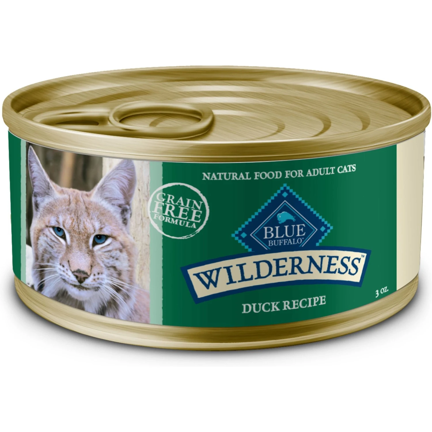 Deliver your dude a delicious duck dinner with Blue Buffalo Wilderness High Protein Grain Free, Natural Adult Pate Wet Cat Food. Purr-fect for your cool cat, this irresistibly tasty wet food is made using only the finest naturally grain and gluten-free ingredients. It starts with high-protein duck, packed with healthy fruits and veggies, then enhanced with vitamins and minerals. Formulated to support the nutritional needs of adult cats, the exclusively wholesome ingredients do not contain any grain, gluten, by-product meals, corn, wheat, soy, artificial flavors or preservatives.