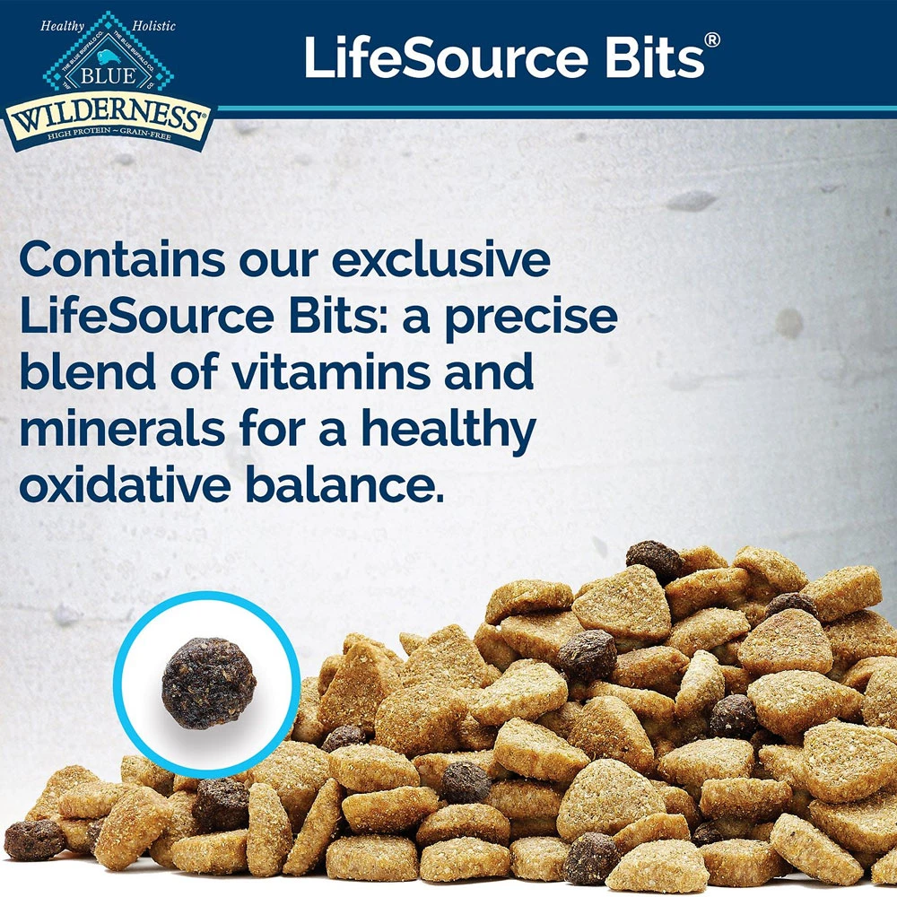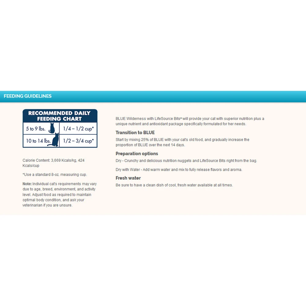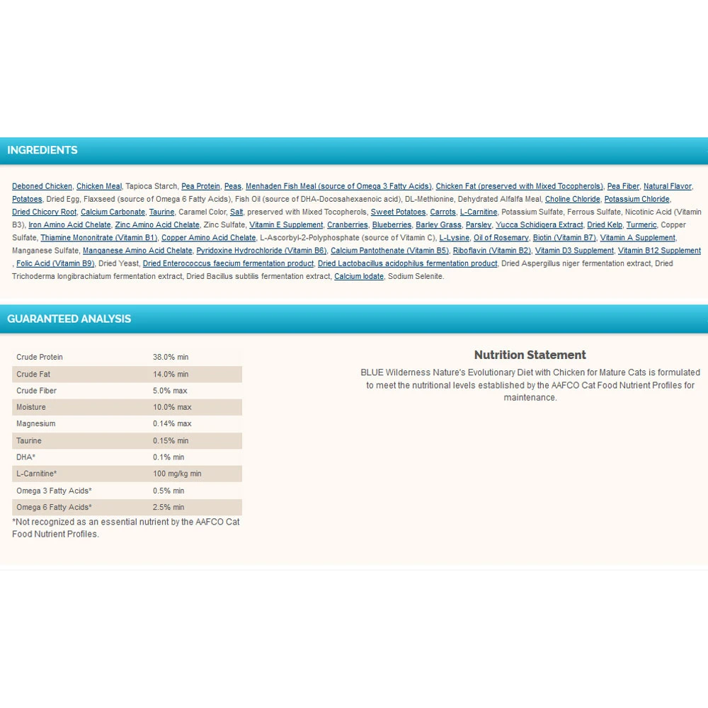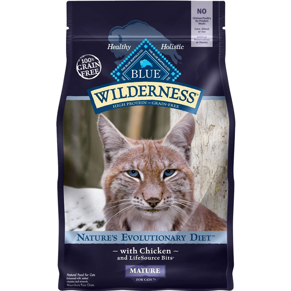 Blue Buffalo Wilderness Mature Chicken Recipe Grain-Free Dry Cat Food. Made with real chicken as the first ingredient and never any grains, gluten, wheat or by-products, it packs a powerful protein punch to support your little hunters wild pursuits in every bowl. Its loaded with antioxidant-rich LifeSource Bits?a unique blend of vitamins, minerals and superfoods to support immunity?plus omegas for a healthy skin and coat, taurine for vision and heart health, and essential amino acids to fuel all those indoor adventures. Plus, it helps maintain healthy digestion and happy tummies with a unique fiber blend in every bite.