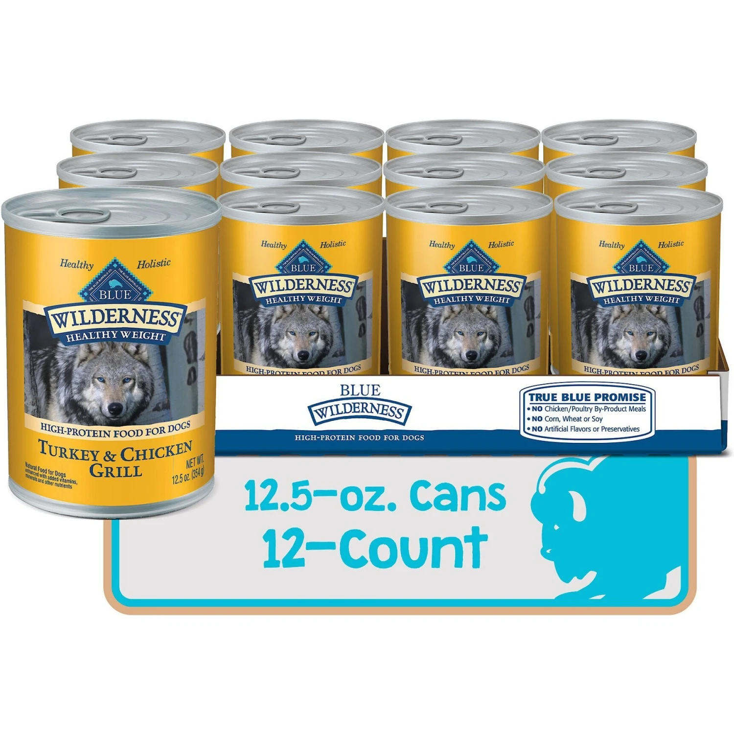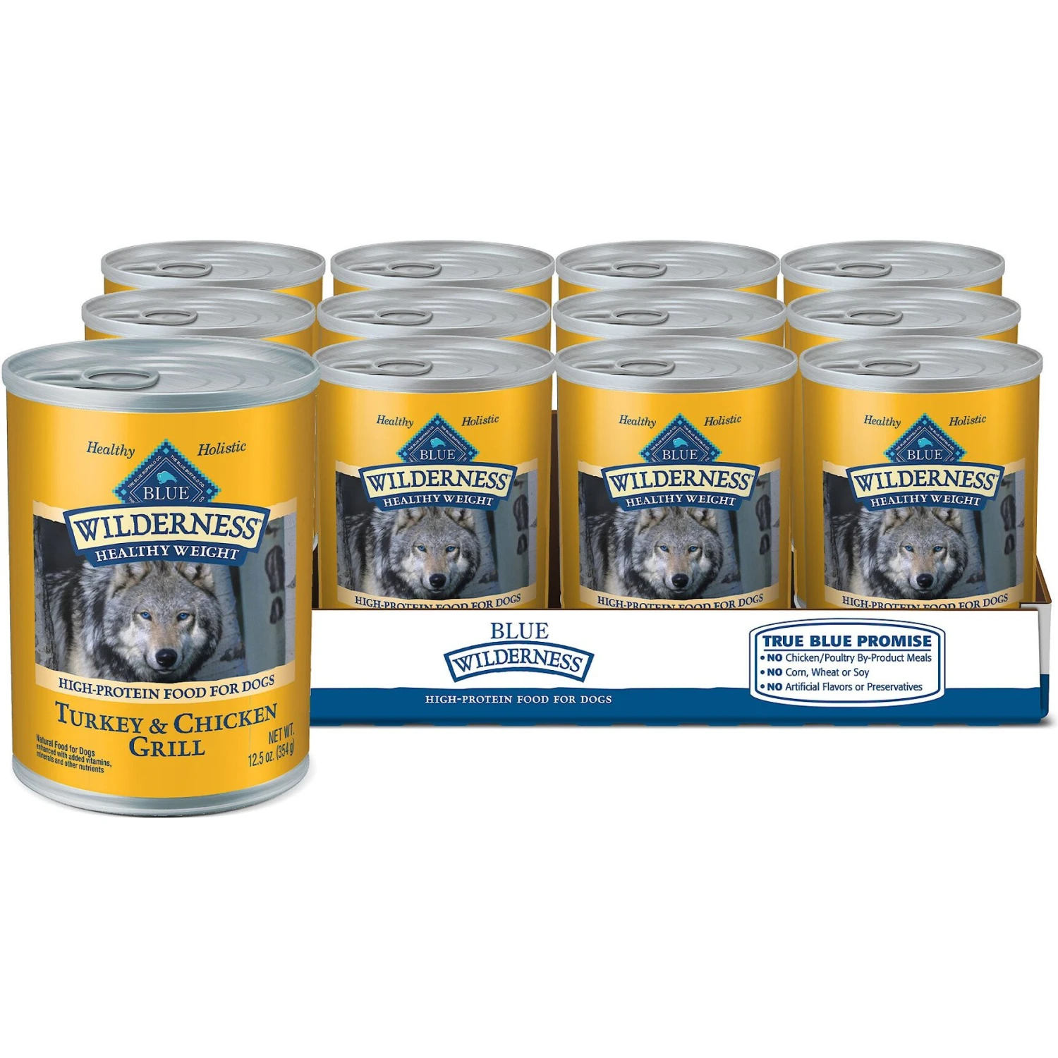 Help get your best buddy feeling happy and healthy with Blue Buffalo Wilderness High Protein Grain Free, Natural Adult Healthy Weight Dog Wet Food. Paw-fect for your doggie dude, this irresistibly tasty wet food is made using only the finest naturally grain and gluten-free ingredients. It starts with high-quality protein from grilled pieces of turkey and chicken, packed with fruits and veggies, then enhanced with vitamins and minerals. Formulated with reduced calories from fat to support healthy weight management, this high-protein dog food is made with wholesome ingredients that do not contain any grain, gluten, by-product meals, corn, wheat, soy, artificial flavors or preservatives.