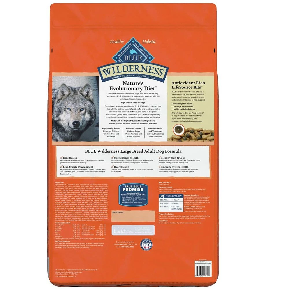 Blue Buffalo Wilderness Large Breed Chicken Recipe Grain-Free Dry Dog Food is designed to satisfy the spirit of your dog’s inner wolf. With real chicken as the very first ingredient, this high-protein, grain-free recipe helps build and maintain lean muscle mass. It also contains antioxidant rich LifeSource Bits, vitamins, minerals and other nutrients, plus glucosamine, chondroitin and EPA to support your big buddy’s joint health and mobility. He’ll howl with delight after every bite!
