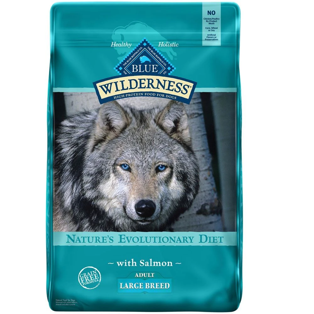 Blue Buffalo Wilderness High Protein Grain Free, Natural Adult Large Breed Dry Dog Food. This protein-rich formula has been specifically designed for the needs of large-breed pups. It features real salmon to help your buddy build and maintain lean muscles along with ingredients like glucosamine and chondroitin to support her joint health. It contains a precise blend of antioxidants, vitamins and minerals to support a healthy immune system along with omega 3 and 6 fatty acids for healthy skin and coats. It’s also made without the use of corn, wheat, soy or meat by-products just the real, high-quality meat that your sweet sidekick craves!