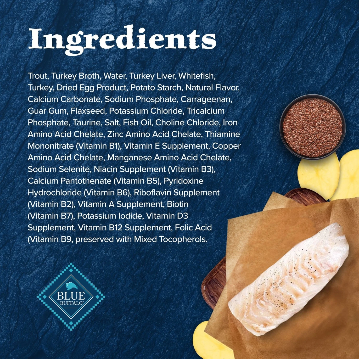 Never leave dinner in doubt with the tasty trout in Blue Buffalo Wilderness Rocky Mountain Recipe High Protein Grain Free, Natural Adult Flaked Wet Cat Food. Purr-fect for your adult amigo, this irresistibly tasty wet food is made using only the finest naturally grain and gluten-free ingredients. It starts with high-protein trout, packed with healthy fruits and veggies, then enhanced with vitamins and minerals. Formulated to support the nutritional needs of adult cats, the exclusively wholesome ingredients do not contain any grain, gluten, by-product meals, corn, wheat, soy, artificial flavors or preservatives.