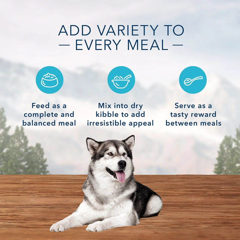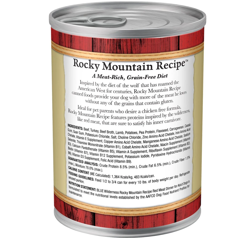 Blue Buffalo Wilderness Rocky Mountain Recipe High Protein Grain Free, Natural Adult Wet Dog Food. Paw-fect for your doggie dude, this irresistibly tasty wet food is made using only the finest naturally grain and gluten-free ingredients. It starts with high-quality protein from real beef, packed with fruits and veggies, then enhanced with vitamins and minerals. Formulated to promote an active lifestyle and healthy muscle growth, this high-protein dog food is made with wholesome ingredients that do not contain any chicken, grain, gluten, by-product meals, corn, wheat, soy, artificial flavors or preservatives.