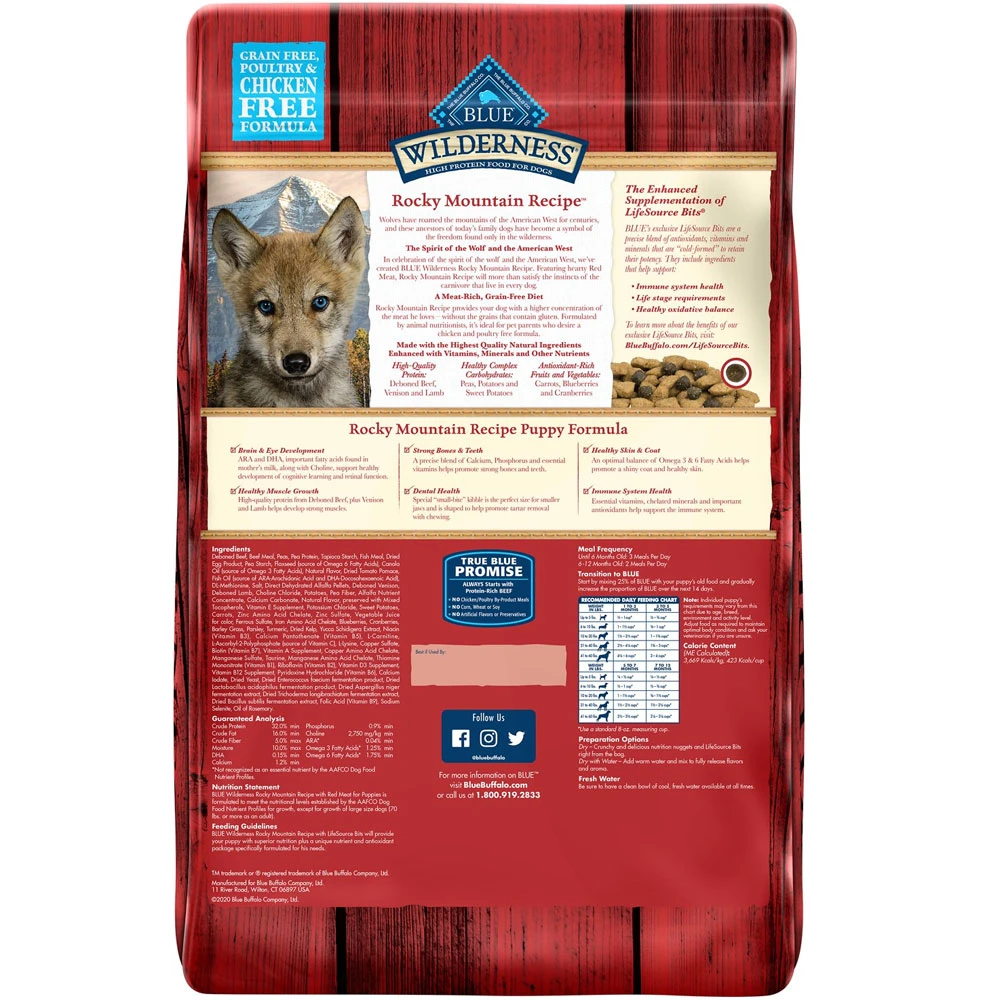 Blue Buffalo Wilderness Rocky Mountain Recipe with Red Meat. This grain-free puppy food is a protein-rich kibble is 100% free from chicken. Instead, it starts off on the right paw with delicious beef as the very first ingredient to help fuel your furry friend, plus it contains DHA to support cognitive development. But the goodness doesn’t stop there, because this recipe also includes vitamins, minerals and other nutrients, along with antioxidant rich LifeSource Bits!