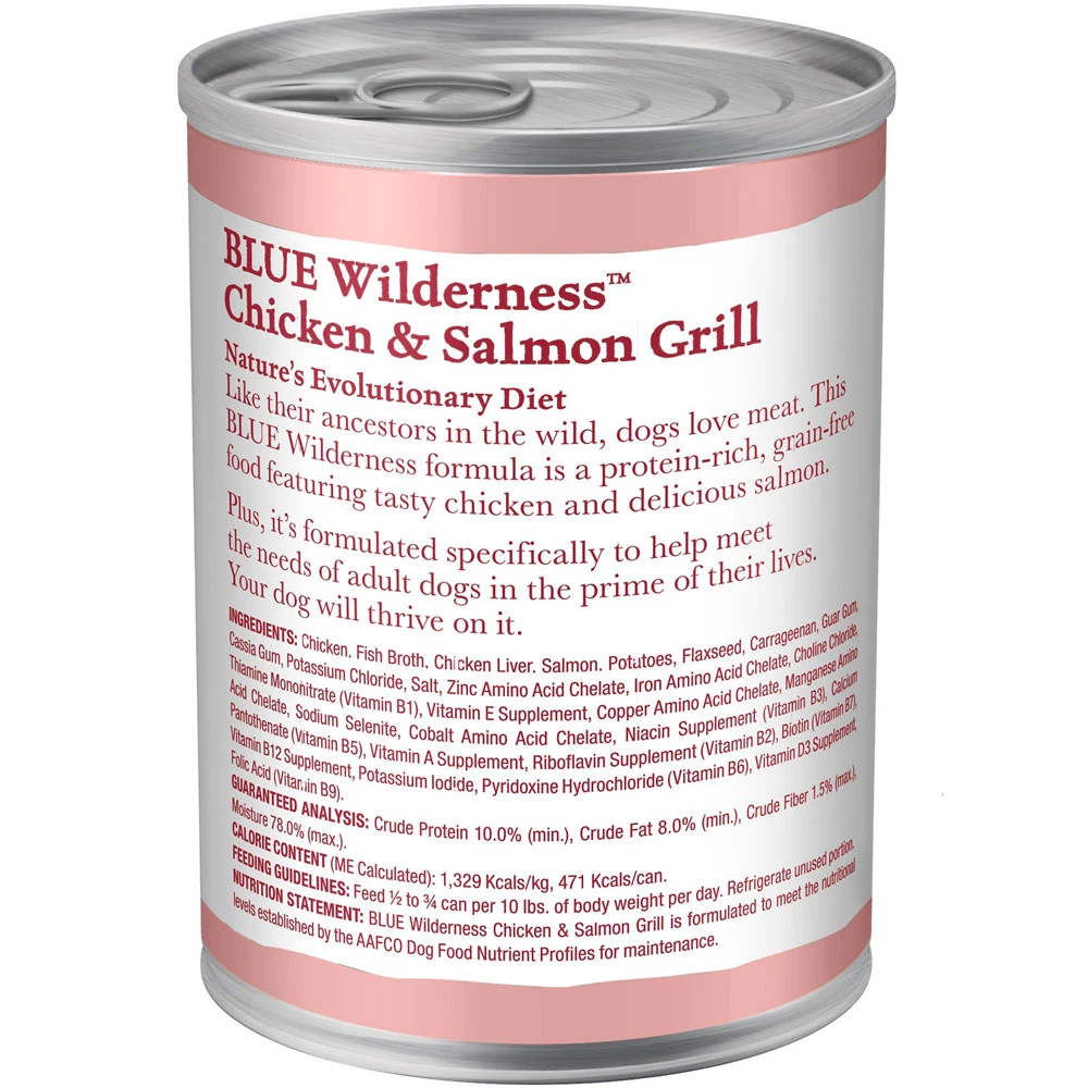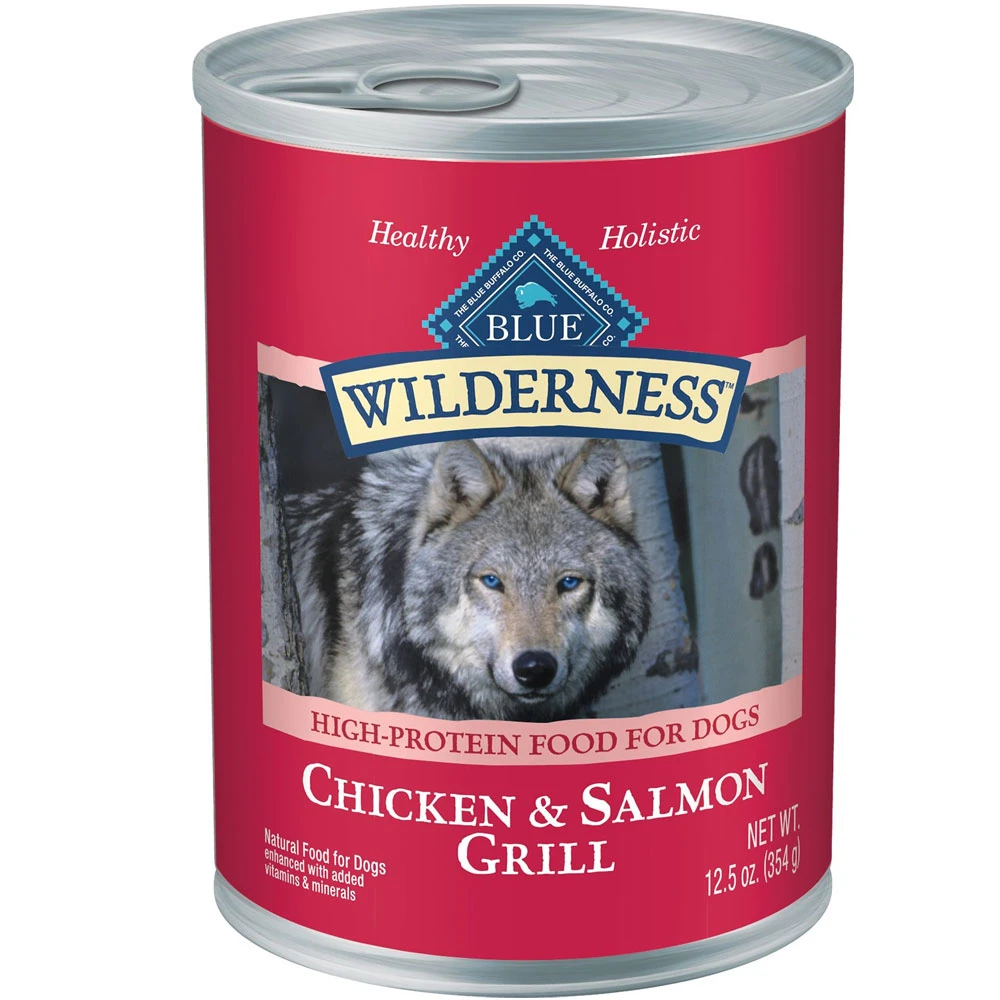 Blue Buffalo Wilderness High Protein Grain Free, Natural Adult Wet Dog Food. Paw-fect for your grown-up guy, this irresistibly tasty wet food is made using only the finest naturally grain and gluten-free ingredients. It starts with high-quality protein from grilled pieces of salmon and chicken, packed with fruits and veggies, then enhanced with vitamins and minerals. Formulated to promote an active lifestyle and healthy muscle growth, this high-protein dog food is made with wholesome ingredients that do not contain any grain, gluten, by-product meals, corn, wheat, soy, artificial flavors or preservatives.