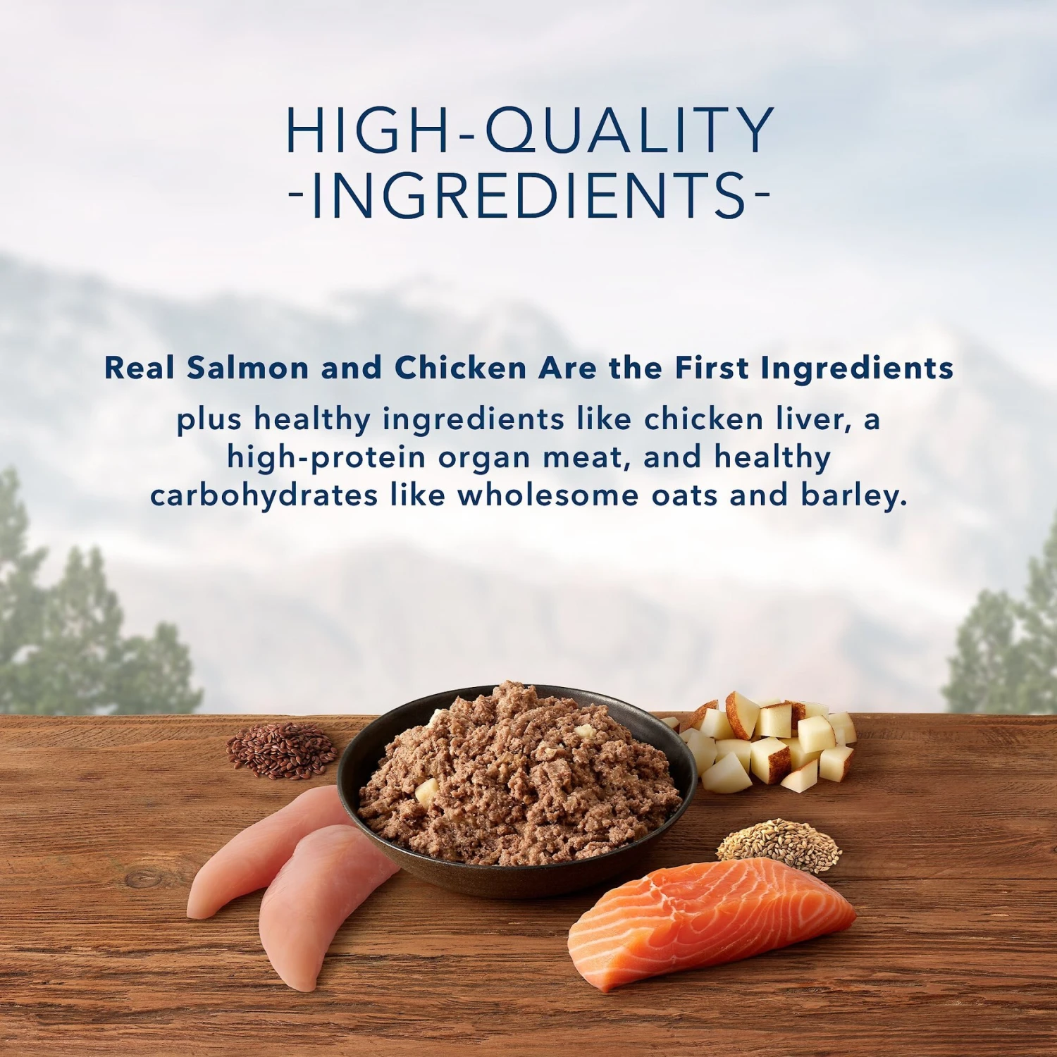 - This high-protein wet food starts with high-quality salmon and chicken as the first ingredients.