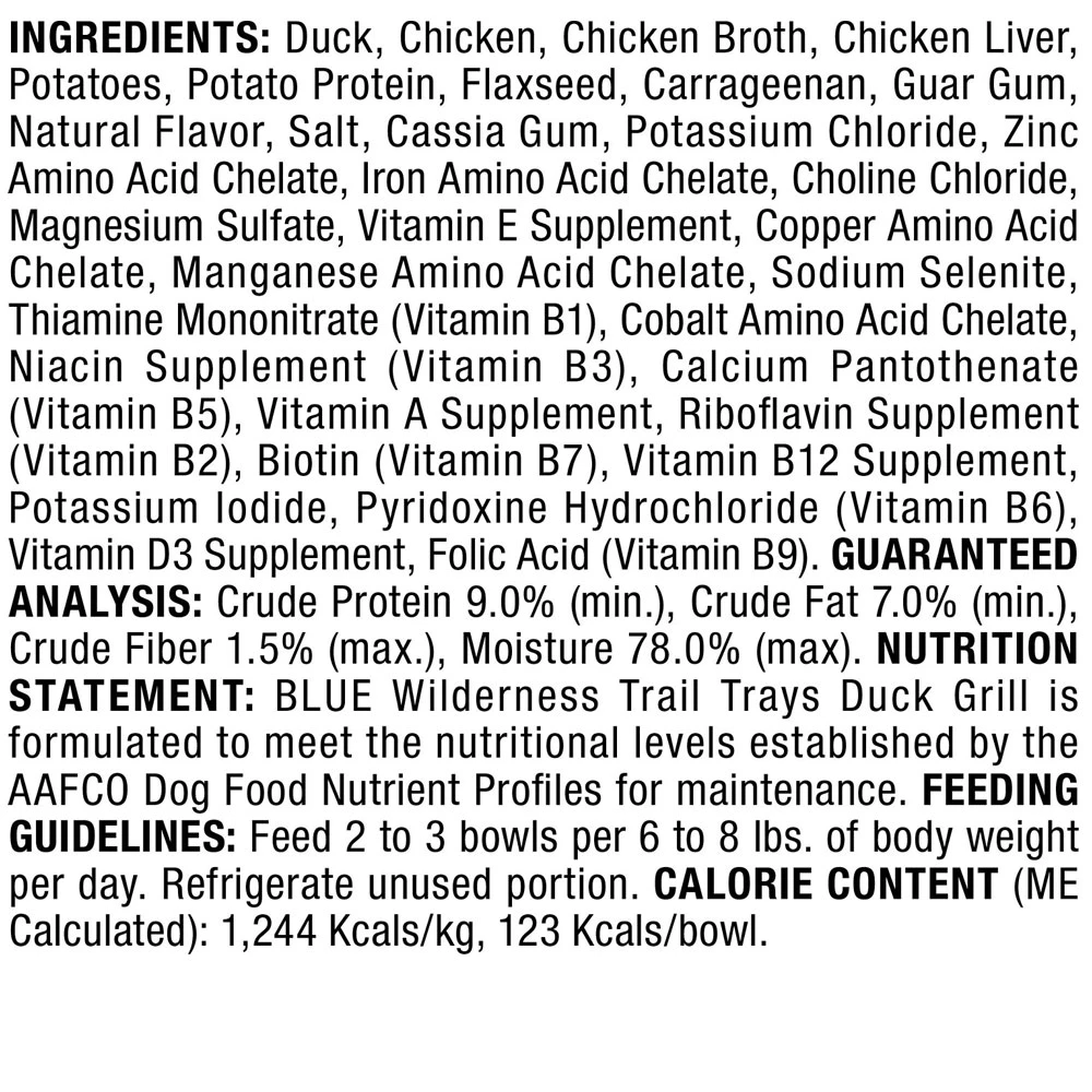 Blue Buffalo Wilderness Trail Trays High Protein Grain Free, Natural Adult Wet Dog Food Cups. Paw-fect for your grown-up guy, this irresistibly tasty wet food is made using only the finest naturally grain and gluten-free ingredients and packaged in a convenient cup. It starts with high-quality protein from tender chunks of grilled duck steeped in a hearty gravy and enhanced with vitamins and minerals. A flavorful addition to your furry friend’s next meal or served on its own, this high-protein dog food is made with wholesome ingredients that do not contain any grain, gluten, by-product meals, corn, wheat, soy, artificial flavors or preservatives.
