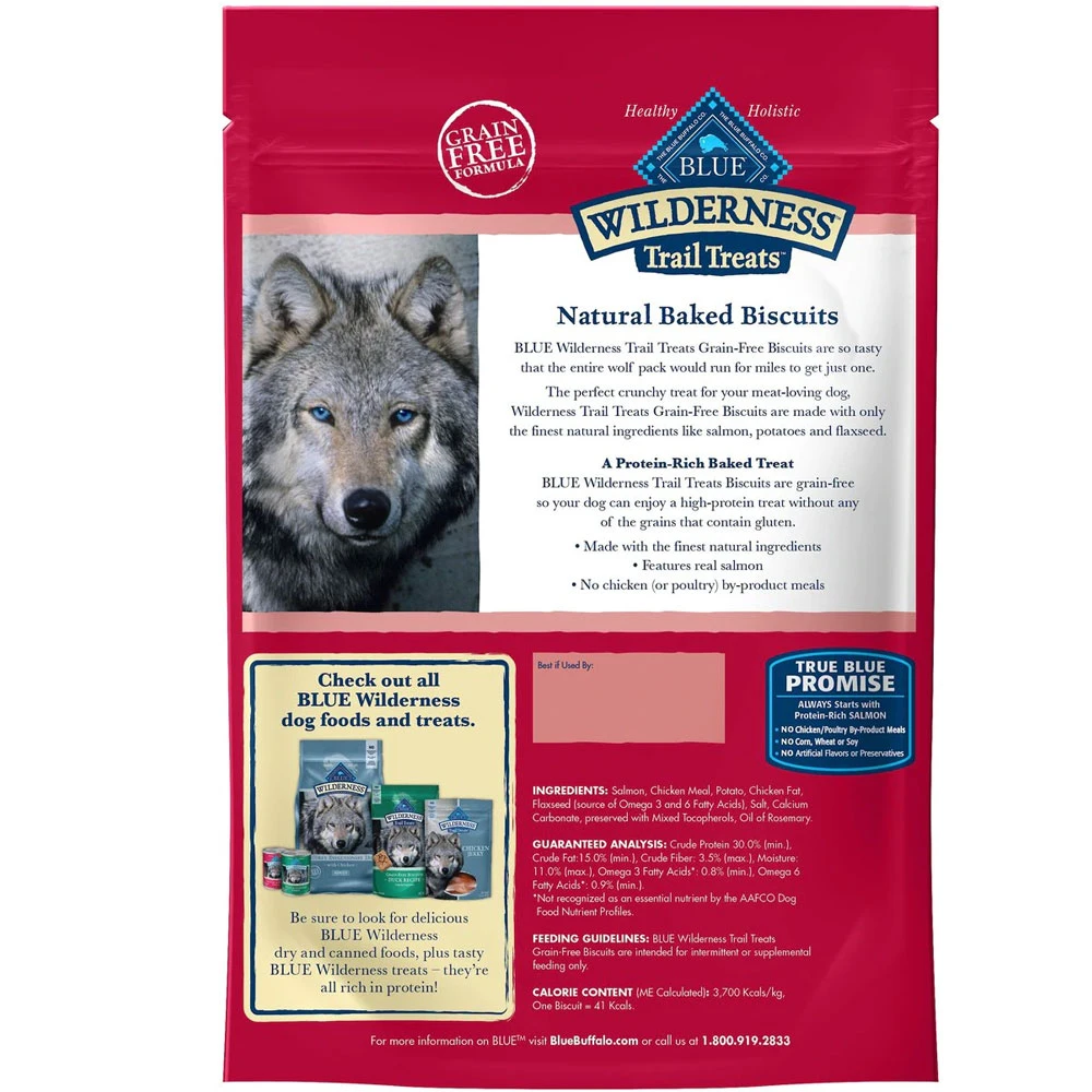 Blue Buffalo Wilderness Trail Treats Grain-Free Salmon Biscuits Dog Treats. These fine and fishy treats are stocked to the surface with protein-rich salmon and pack a satisfying crunch your dog will love. They’ve got a grain-free recipe and a tooth-healthy bite, with vitamins and fatty acids for a healthy boost. Feed them on the trail, in the dog park or even on the couch!