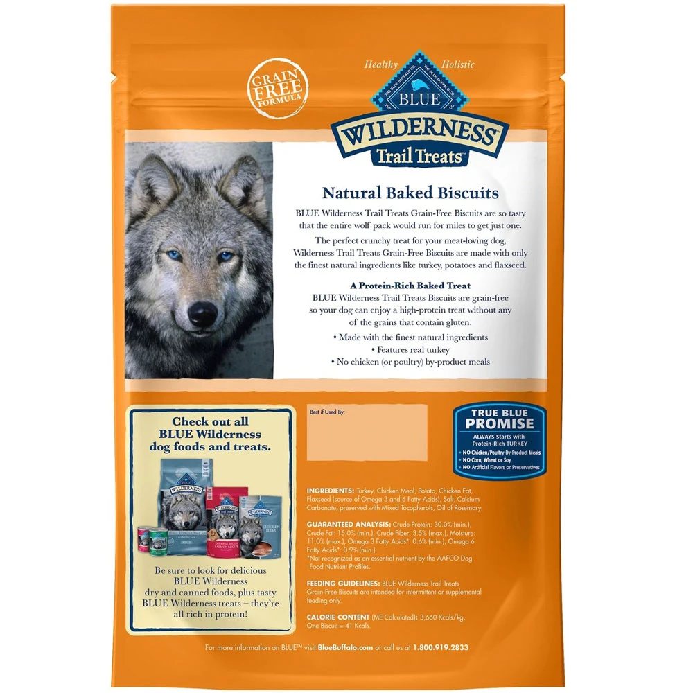 Blue Buffalo Wilderness Trail Treats Grain-Free Turkey Biscuits Dog Treats. These gobblin’-good biscuits are full to the tail-feathers with natural protein and grain-free to complement your pup’s streamlined diet. They’ve got a naturally crunchy texture that helps clean teeth as dogs chew and a vitamin, mineral and fatty-acid enriched recipe that’ll help your buddy thrive. Get ready for lots of happy barking when you bring out these crunchy snacks!