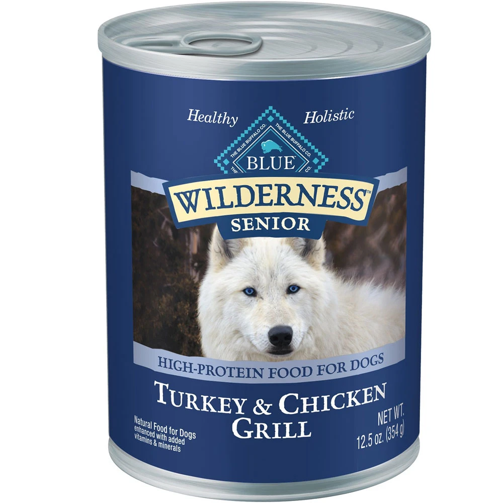 Blue Buffalo Wilderness High Protein Grain Free, Natural Senior Wet Dog Food. Paw-fect for your senior sidekick, this irresistibly tasty wet food is made using only the finest naturally grain and gluten-free ingredients. It starts with high-quality protein from grilled turkey and chicken, packed with fruits and veggies, then enhanced with vitamins and minerals. This food for mature dogs is made with wholesome ingredients that do not contain any grain, gluten, by-product meals, corn, wheat, soy, artificial flavors or preservatives.