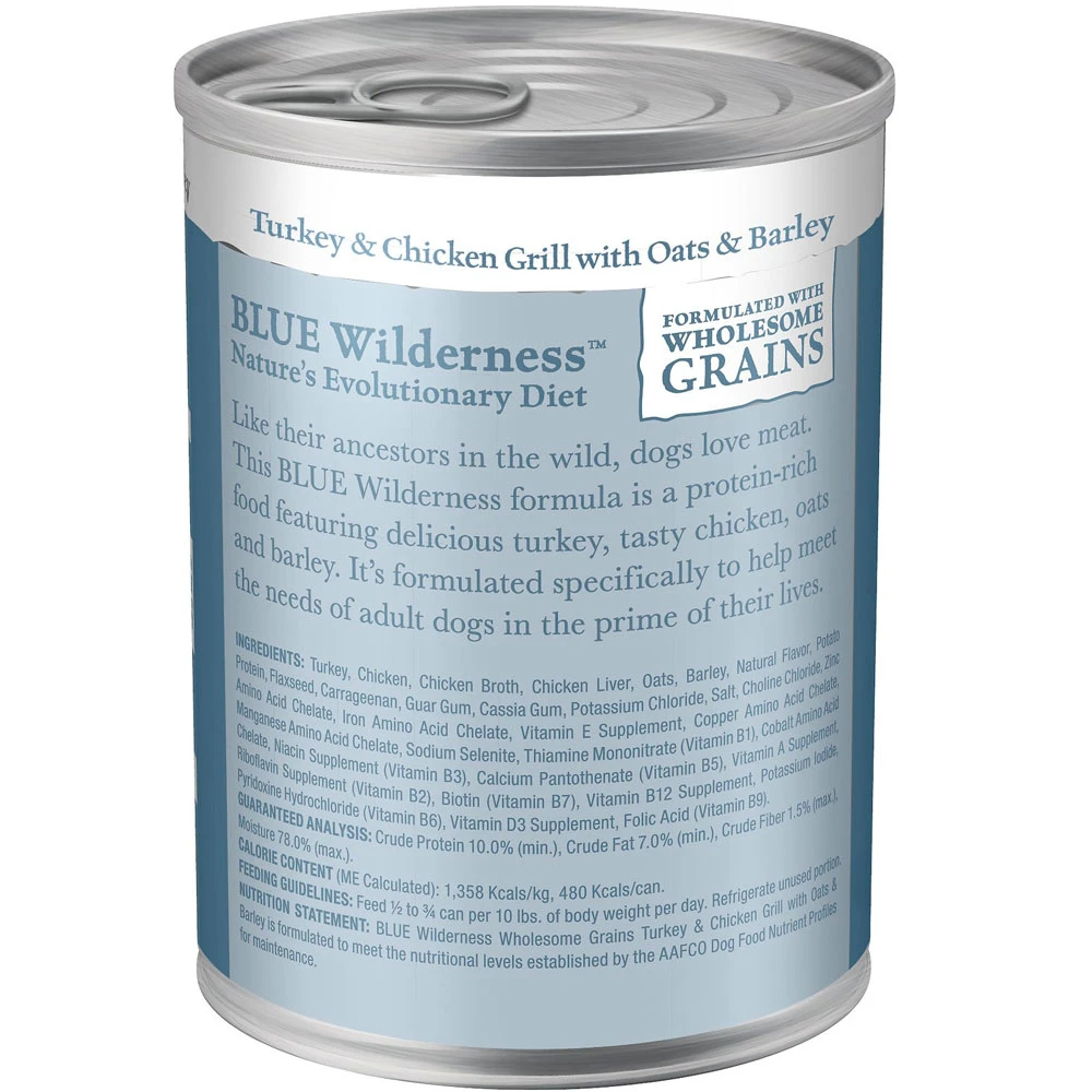 Blue Buffalo Wilderness Turkey & Chicken Grill with Oats & Barley Adult Wet Dog Food. Featuring a delicious mix of protein-rich turkey and chicken, this natural wet food satisfies your dog’s instinctual craving for meat while supporting his energy needs with complex carbohydrates from wholesome grains. Plus, you’ll feel good knowing Blue Buffalo dog food is 100% free from by-product meals and fillers like corn, wheat and soy. Choose to treat your pooch three different ways with this special food as a mouth-watering treat, to enrich his dry food or as a complete meal.